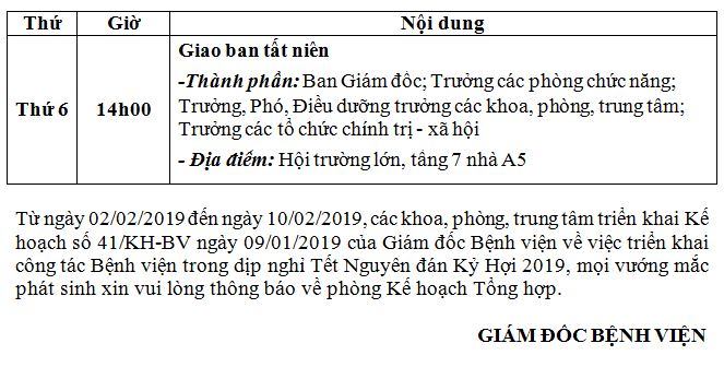 Lịch công tác tuần từ ngày 28/01/2019 đến ngày 02/02/2019 Tài liệu đi kèm:Lịch công tác tuần (Bản word)