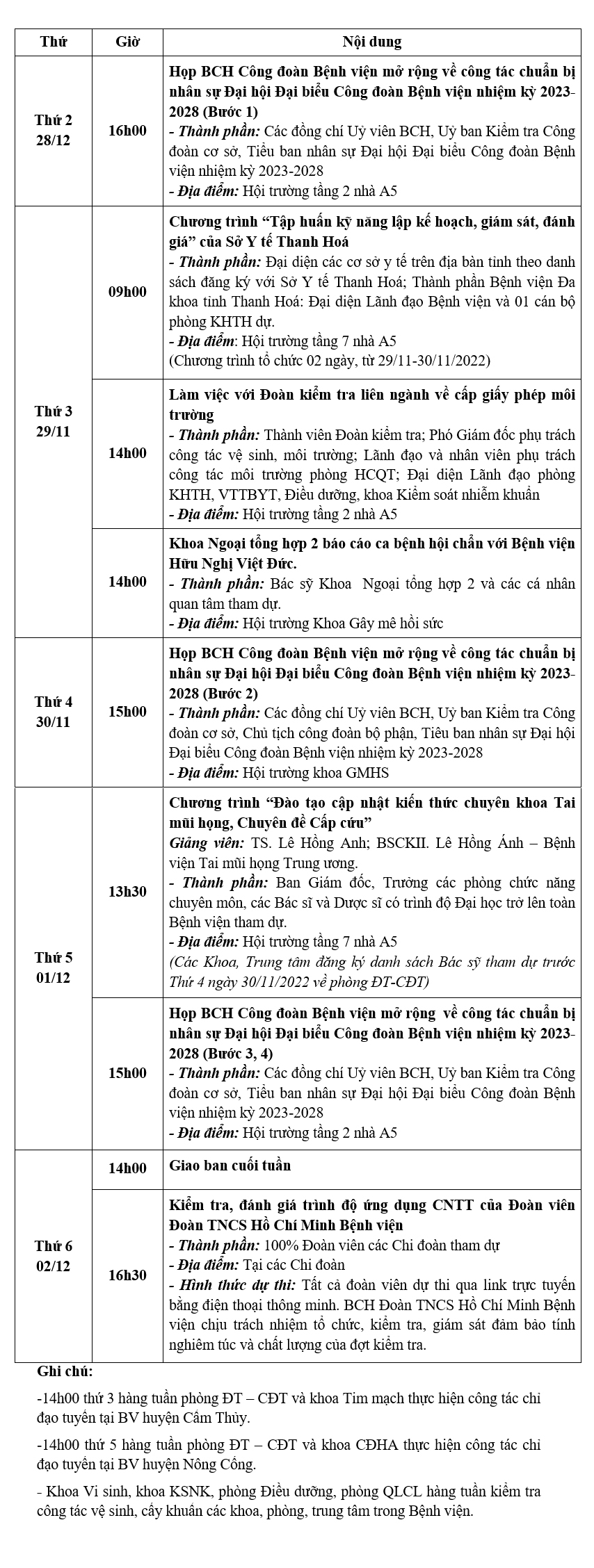Lịch công tác tuần từ ngày 28/11/2022 đến ngày 02/12/2022 Tài liệu đi kèm:Lịch công tác tuần (File word)