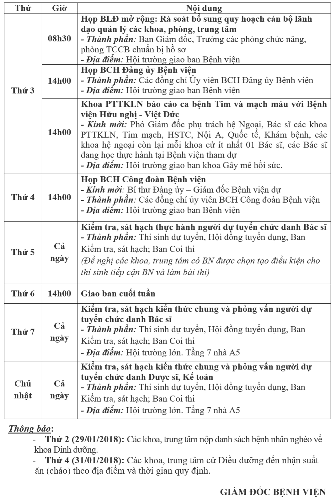 Lịch công tác tuần từ ngày 29/01/2018 đến 04/02/2018