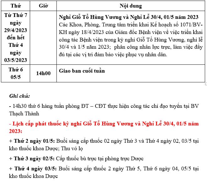 Lịch công tác tuần từ ngày 29/4/2023 đến ngày 7/5/2023 Tài liệu đi kèm:Lịch công tác tuần (File word)