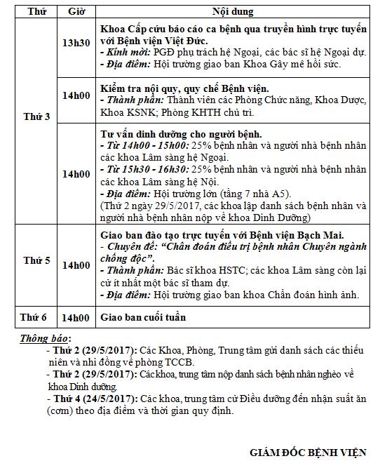 Lịch công tác tuần từ ngày 29/5/2017 đến ngày 2/6/2017