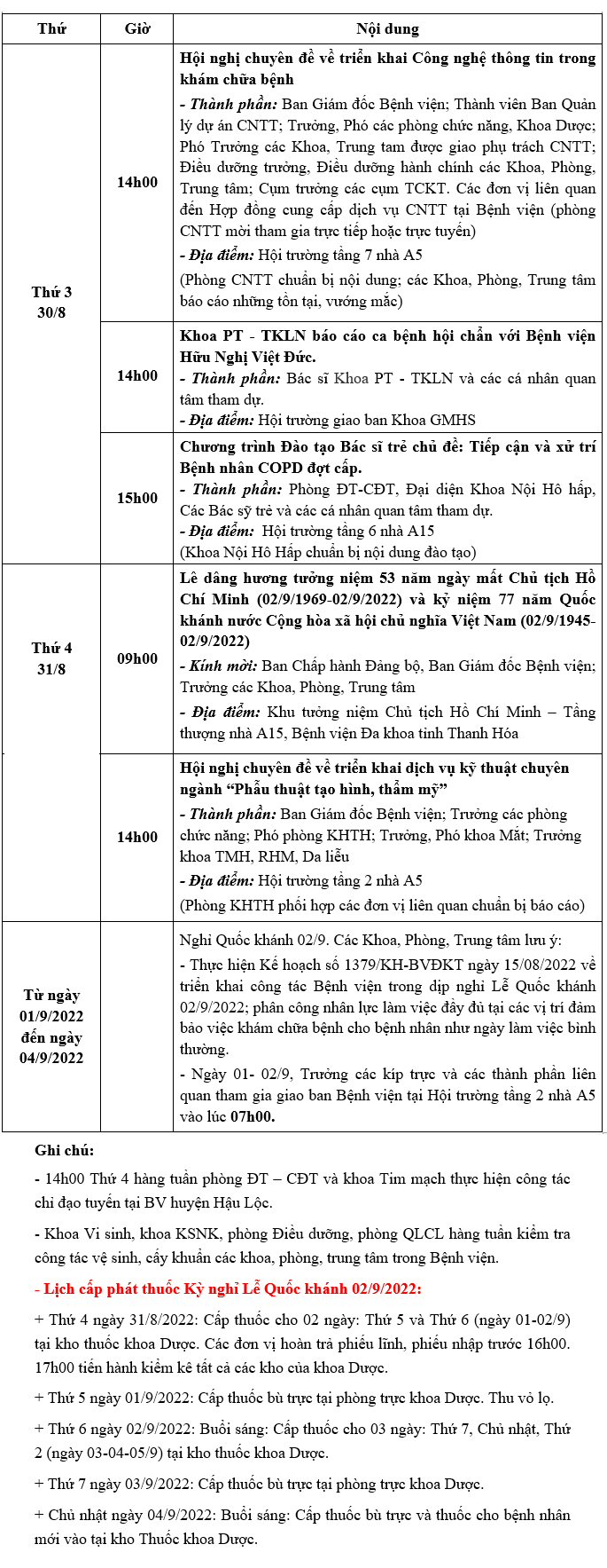 Lịch công tác tuần từ ngày 29/8/2022 đến ngày 04/9/2022
