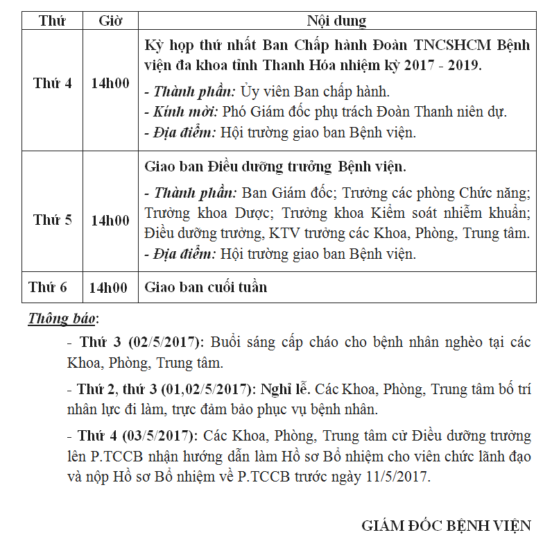 Lịch công tác tuần từ ngày 3/5/2017 đến ngày 5/5/2017
