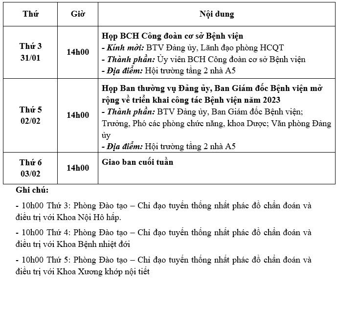 Lịch công tác tuần từ ngày 30/01/2023 đến ngày 03/02/2023 Tài liệu đi kèm:Lịch công tác tuần (File word)