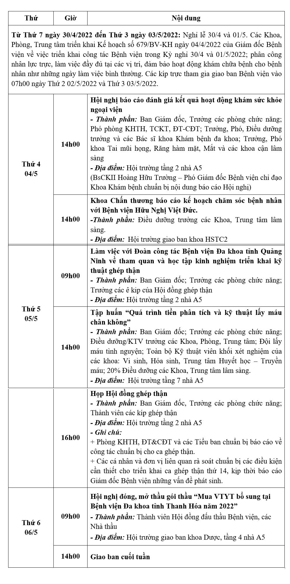 Lịch công tác tuần từ ngày 30/4/2022 đến ngày 06/5/2022 Tài liệu đi kèm:Lịch công tác tuần (file word)