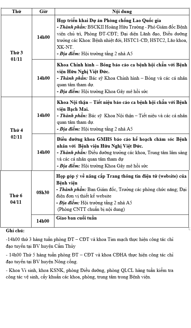Lịch công tác tuần từ ngày 31/10/2022 đến ngày 04/11/2022 Tài liệu đi kèm:Lịch công tác tuần (File word)