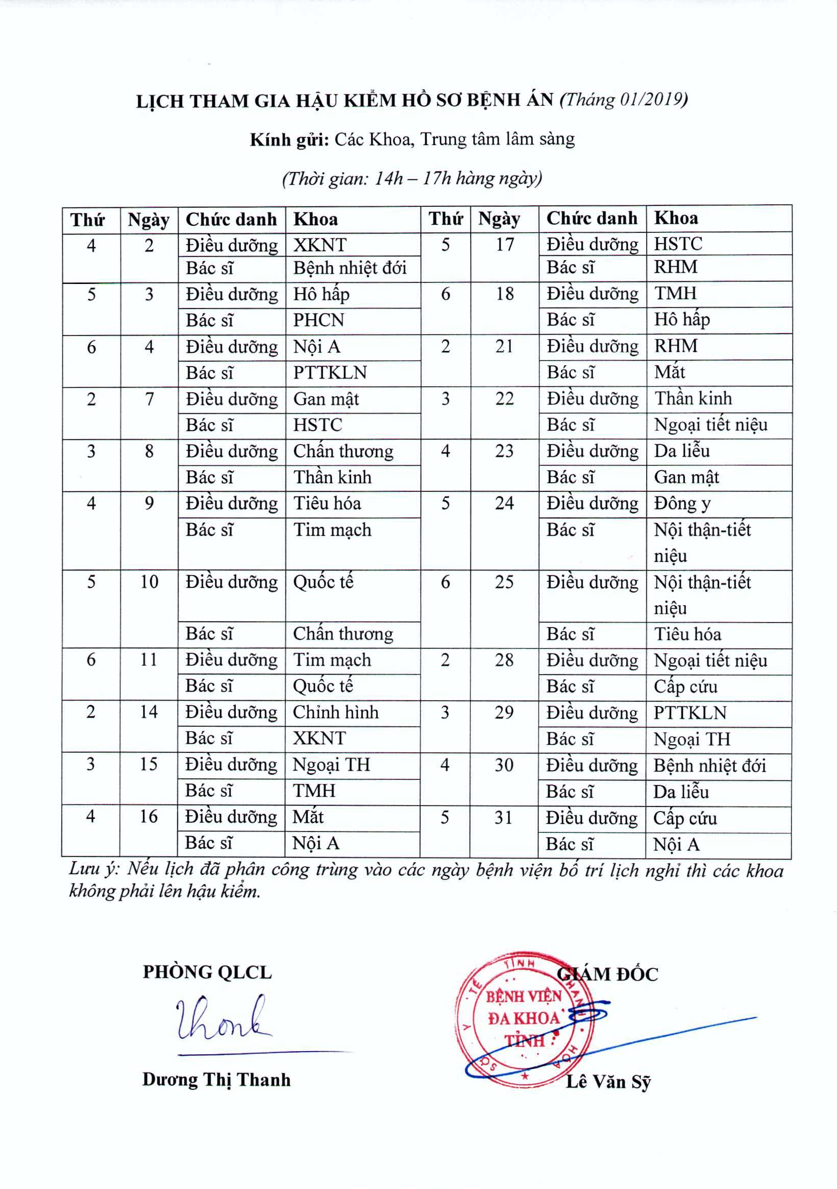 Lịch hậu kiểm hồ sơ bệnh án tháng 1/2019