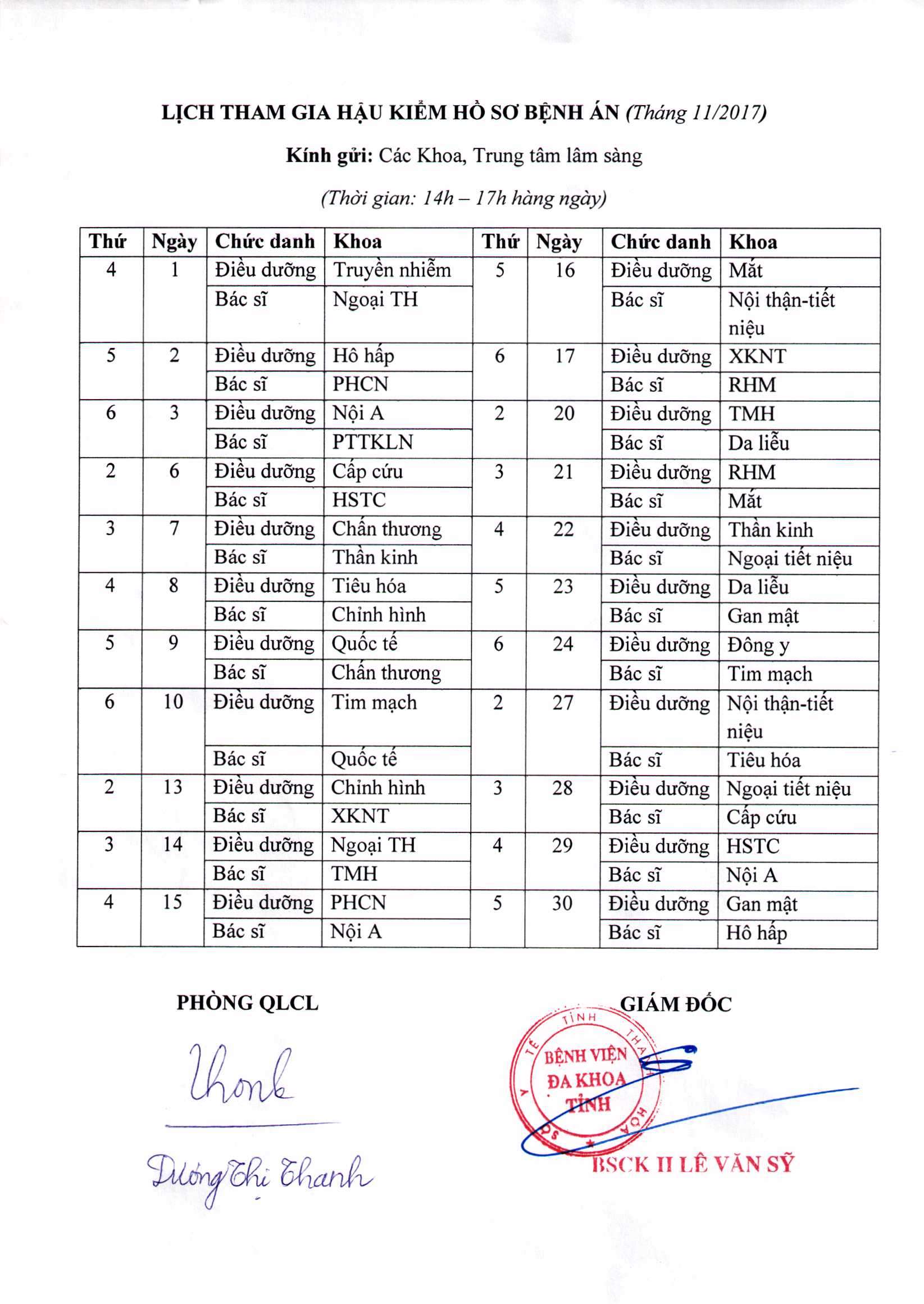 Lịch hậu kiểm hồ sơ bệnh án tháng 11/2017