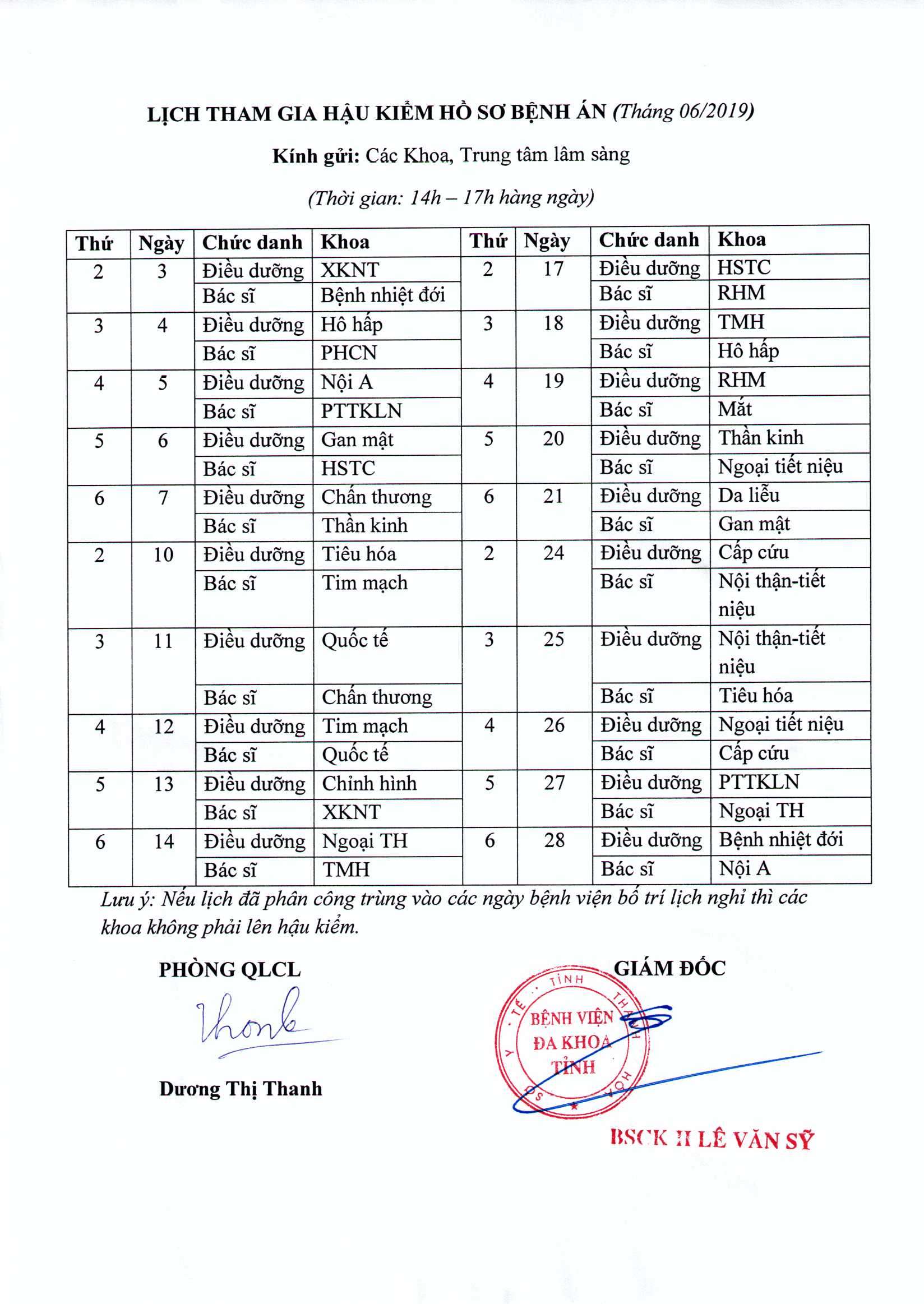 Lịch hậu kiểm hồ sơ bệnh án tháng 6/2019