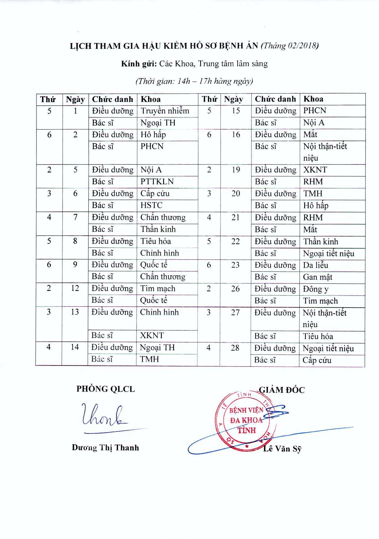 Lịch tham gia hậu kiểm hồ sơ bệnh án tháng 02/2018