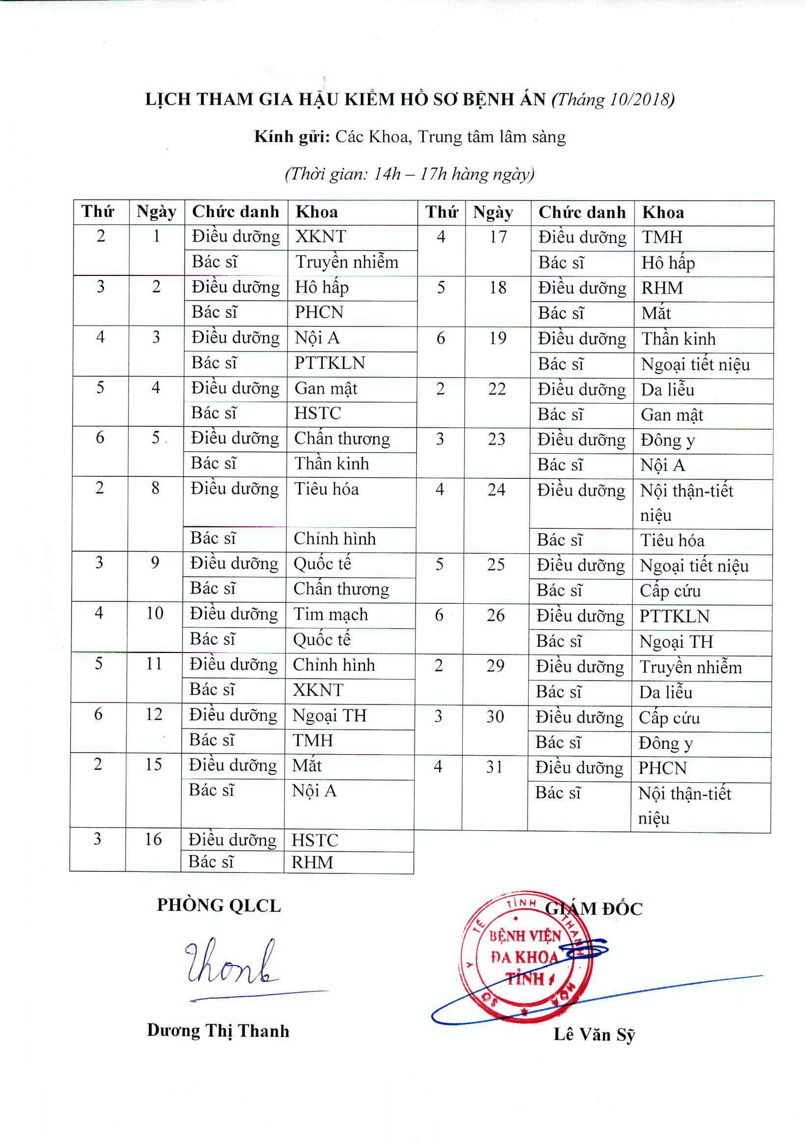Lịch tham gia hậu kiểm hồ sơ bệnh án tháng 10/2018