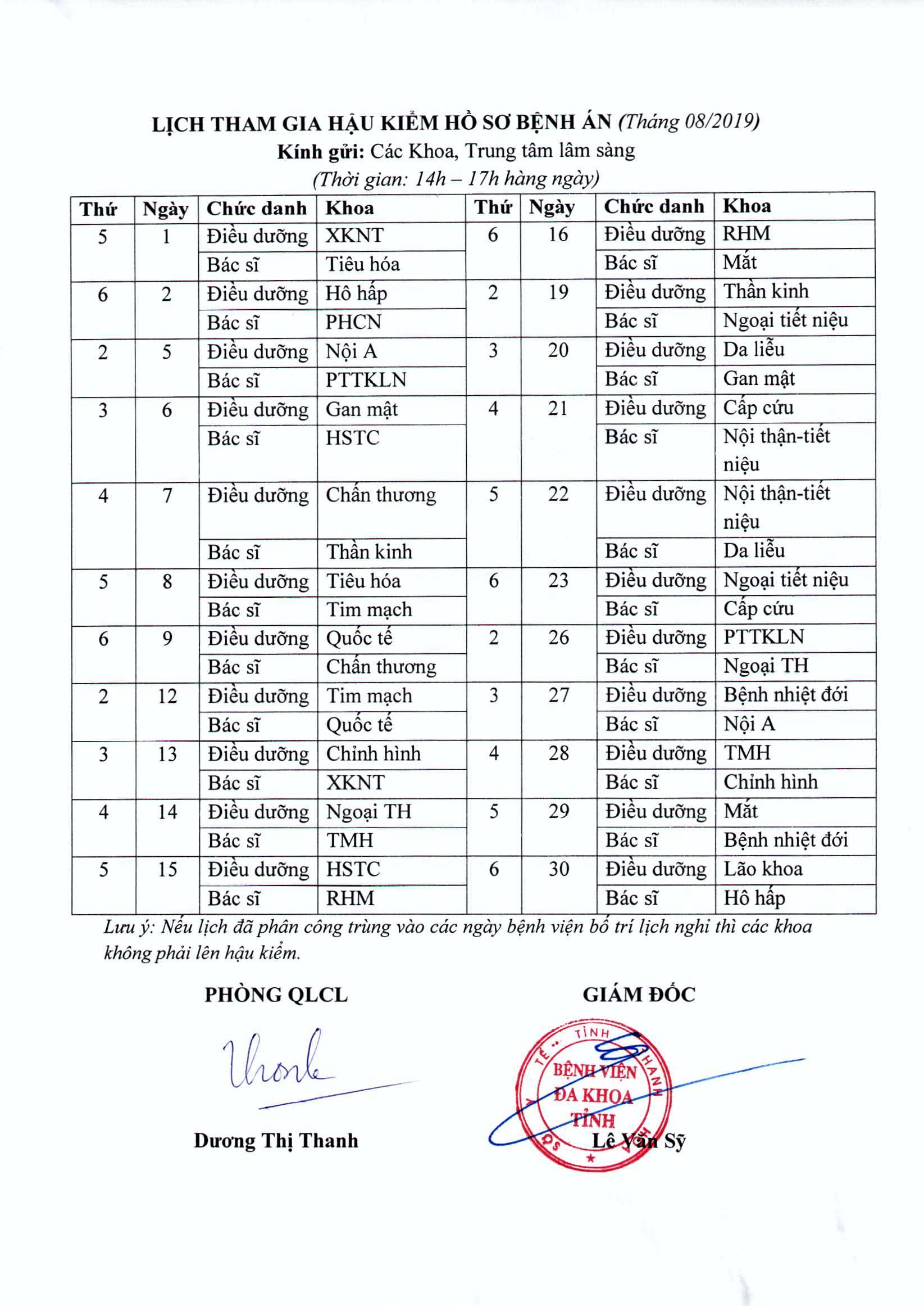 Lịch tham gia hậu kiểm hồ sơ bệnh án tháng 8/2019