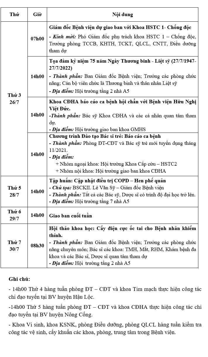 Lịch tuần từ ngày 25/7/2022 đến ngày 30/7/2022