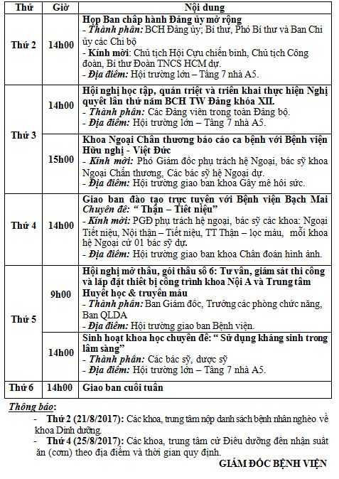 Thông báo thay đổi lịch công tác tuần từ ngày 21/8/2017 đến ngày 25/8/2017 Lịch tuần thay đổi: 14h00 Thứ 5 (ngày 24/8/2017) hoãn lịch giao ban đào tạo trực tuyến với Bệnh viện Bạch Mai Tài liệu đi kèm:Lịch tuần thay đổi