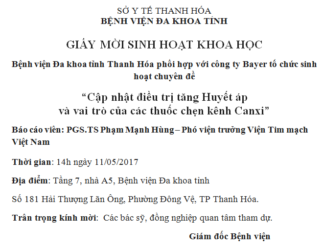 SỞ Y TẾ THANH HÓA BỆNH VIỆN ĐA KHOA TỈNH GIẤY MỜI SINH HOẠT