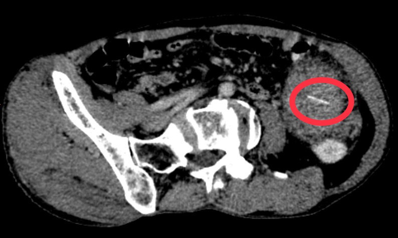 Qua thăm khám, siêu âm và chụp cắt lớp vi tính ổ bụng có tiêm thuốc cản quang cho thấy có khối tỉ trọng hỗn hợp nằm cạnh trước đại tràng trái gồm dịch, mô mềm và phần tăng tỉ trọng kích thước 24 x 0,5mm (nghi ngờ dị vật, xung quanh có thâm nhiễm mỡ). Bệnh nhân được chỉ định phẫu thuật mở ổ bụng gắp dị vật.