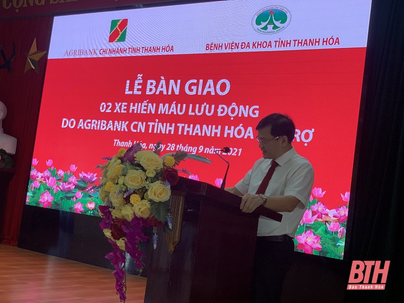 Ngày 28-9, Ngân hàng Nông nghiệp và Phát triển nông thôn chi nhánh Thanh Hóa (Agribank Thanh Hóa) đã trao tặng xe hiến máu lưu động cho Bệnh viện Đa khoa tỉnh Thanh Hóa.