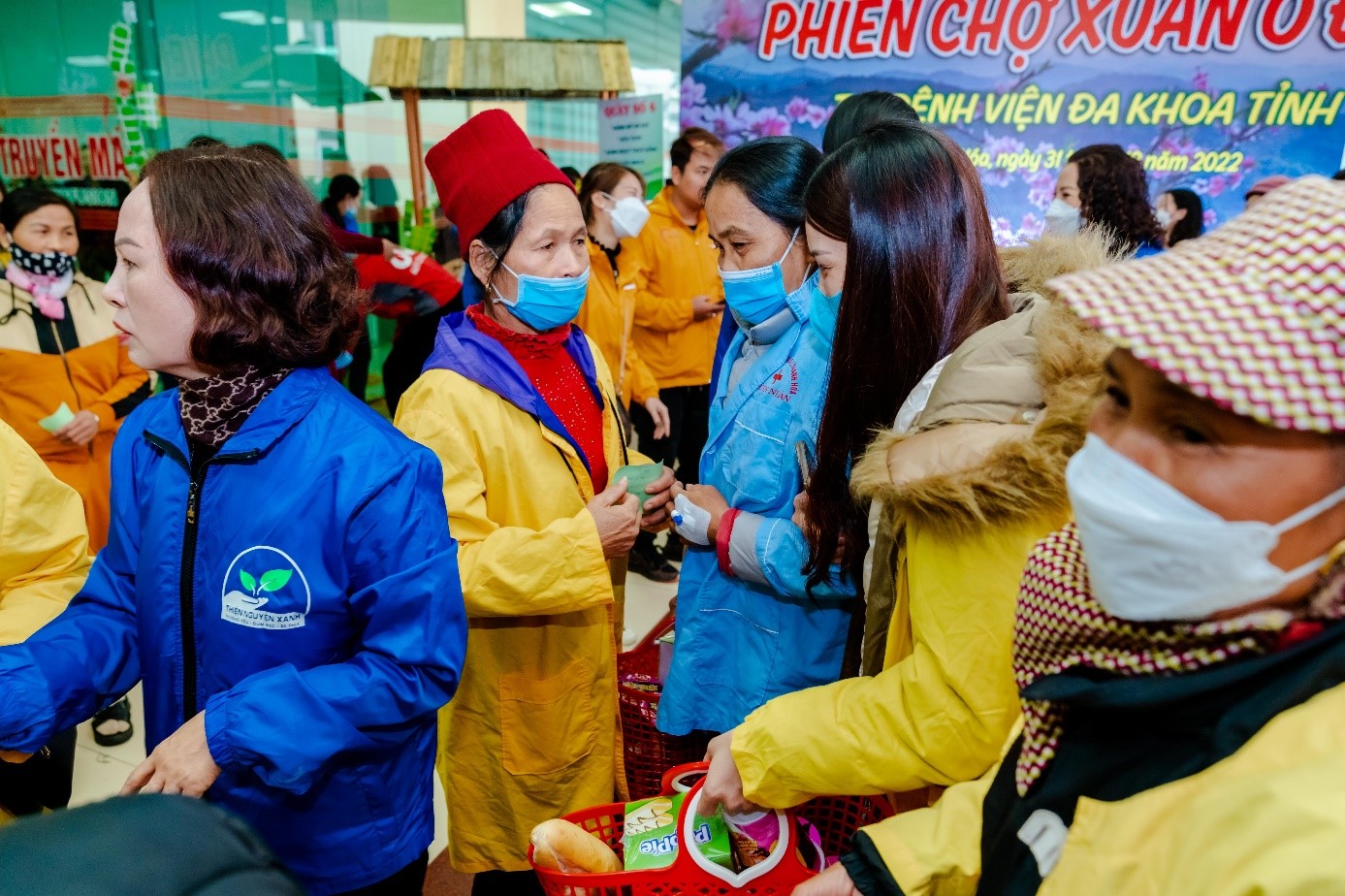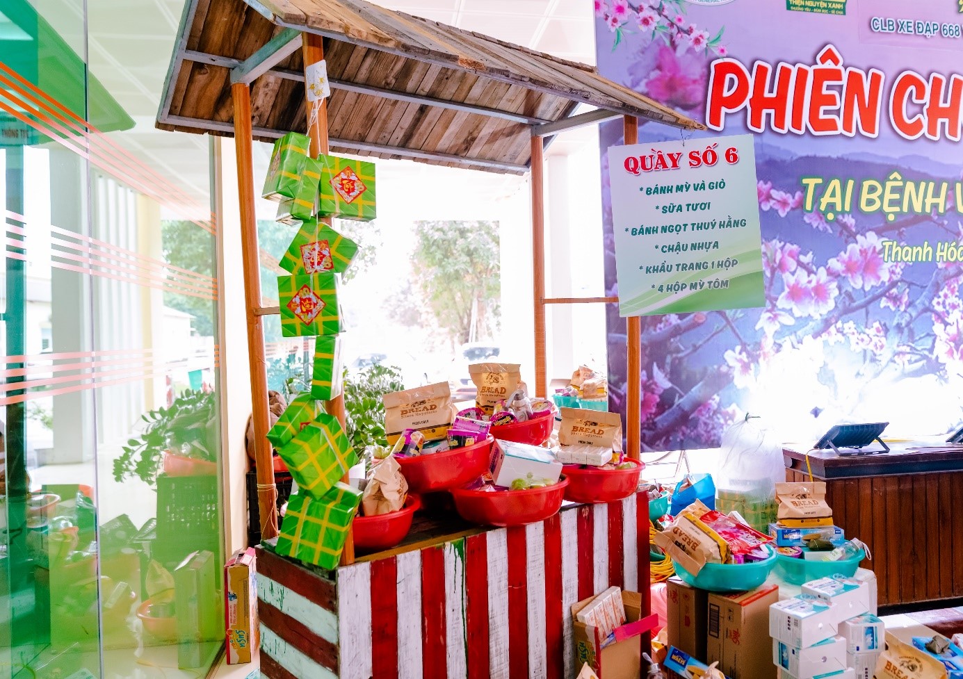 Dịp Tết năm nay, Phiên chợ được sự ủng hộ và tham gia nhiệt tình của các nhà hảo tâm với 06 gian hàng, gồm các nhu yếu phẩm thiếu yếu như, sữa, bánh kẹo, hoa quả, bánh chưng, vật dụng cá nhân…phục vụ nhu cầu mua sắm cho hơn 600 gia đình bệnh nhân có hoàn cảnh khó khăn đang điều trị tại Bệnh viện Đa khoa tỉnh Thanh Hoá.