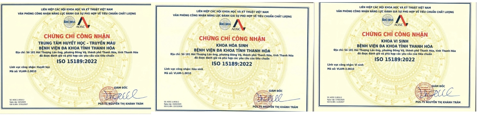 Trước đó, vào năm 2019, cả ba khoa xét nghiệm của Bệnh viện đã được tổ chức AOSC công nhận đạt tiêu chuẩn ISO 15189:2012. Đây là thành quả từ những nỗ lực đầu tư bài bản, nghiêm túc trong việc xây dựng và áp dụng hệ thống quản lý chất lượng xét nghiệm theo tiêu chuẩn Quốc tế. Thời điểm đó, Bệnh viện Đa khoa tỉnh Thanh Hóa là một trong số ít đơn vị tuyến tỉnh có cùng lúc ba khoa xét nghiệm được công nhận tiêu chuẩn ISO15189.