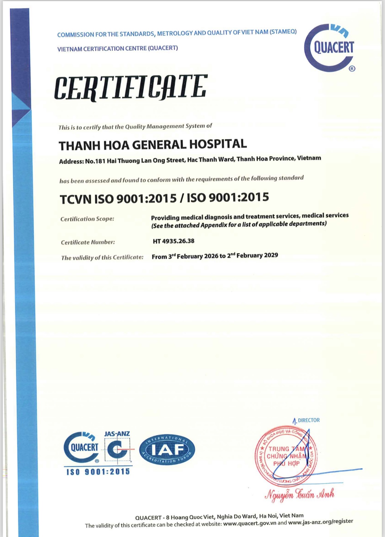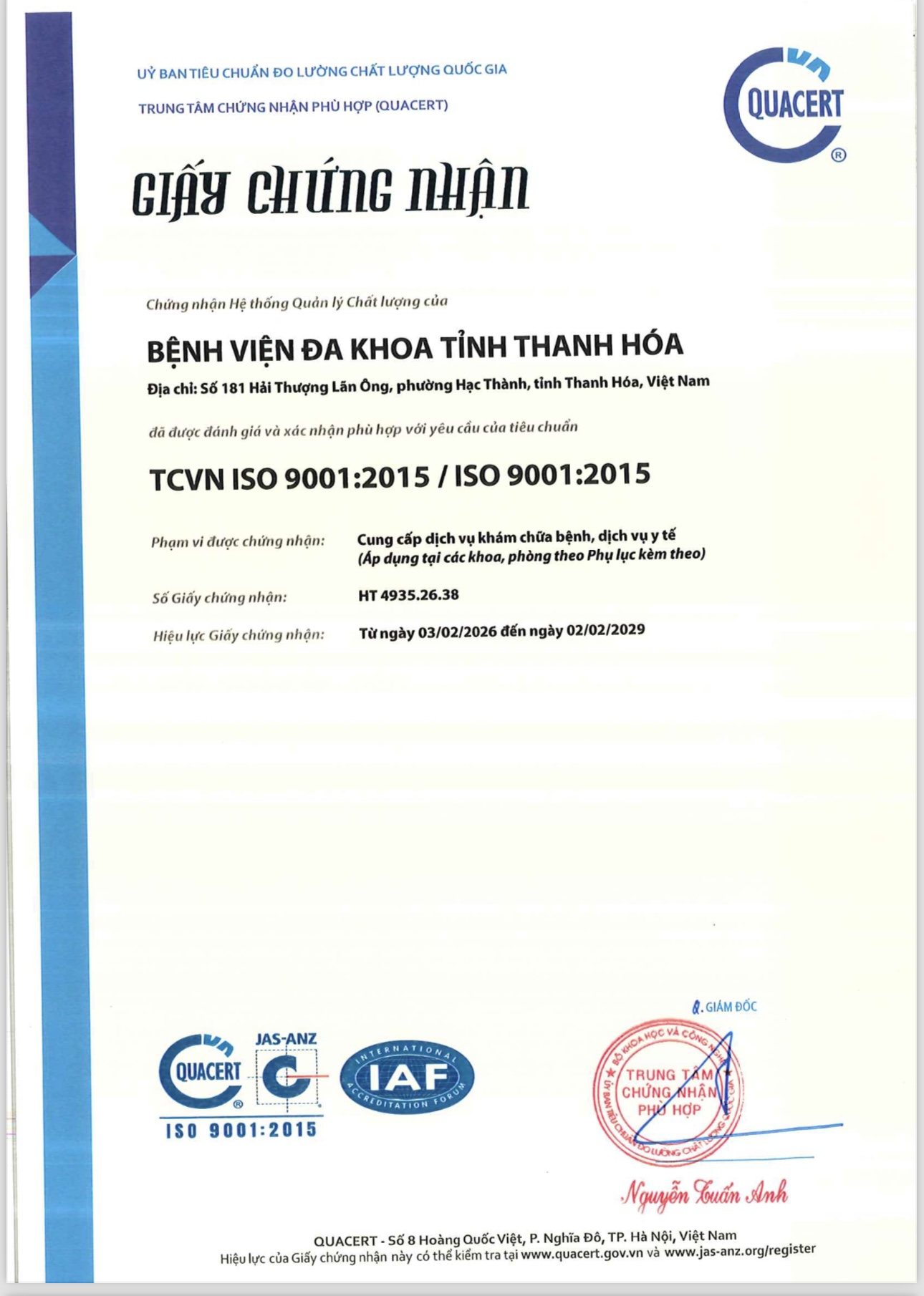 Sau quá trình triển khai bài bản, nghiêm túc và đồng bộ, ngày 03/02/2026, Bệnh viện Đa khoa tỉnh Thanh Hóa đã chính thức được Trung tâm Chứng nhận Phù hợp (QUACERT) cấp Giấy chứng nhận Hệ thống quản lý chất lượng theo tiêu chuẩn TCVN ISO 9001:2015 / ISO 9001:2015.