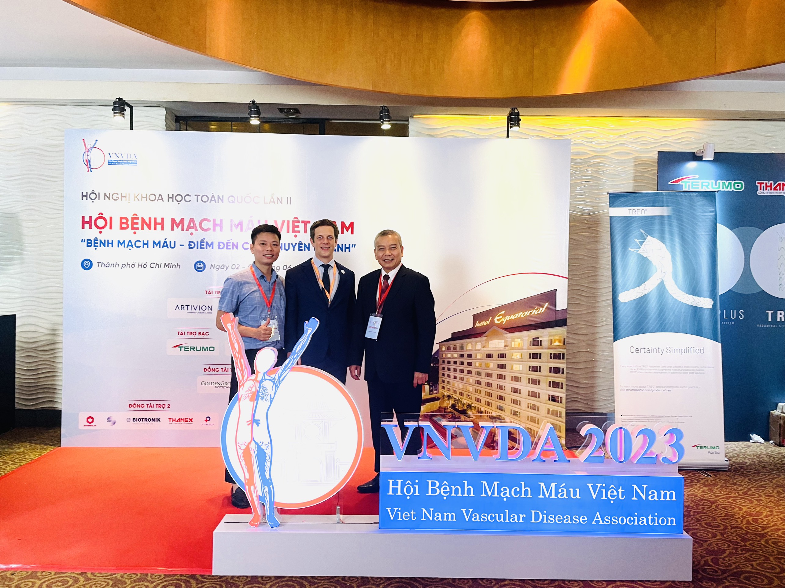 Ths.Bs. Nguyễn Văn Ngọc chụp ảnh với PGS Nguyễn Hữu Ước chủ tịch hội mạch máu Việt Nam và Mr ThoMas giám đốc Metronic đến từ cộng hoà Pháp