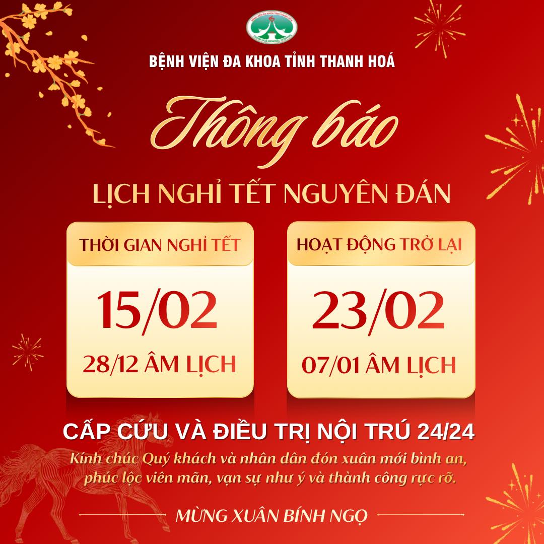 Bệnh viện Đa khoa tỉnh Thanh Hóa trân trọng thông báo lịch nghỉ Tết Nguyên đán Bính Ngọ 2026 như sau: