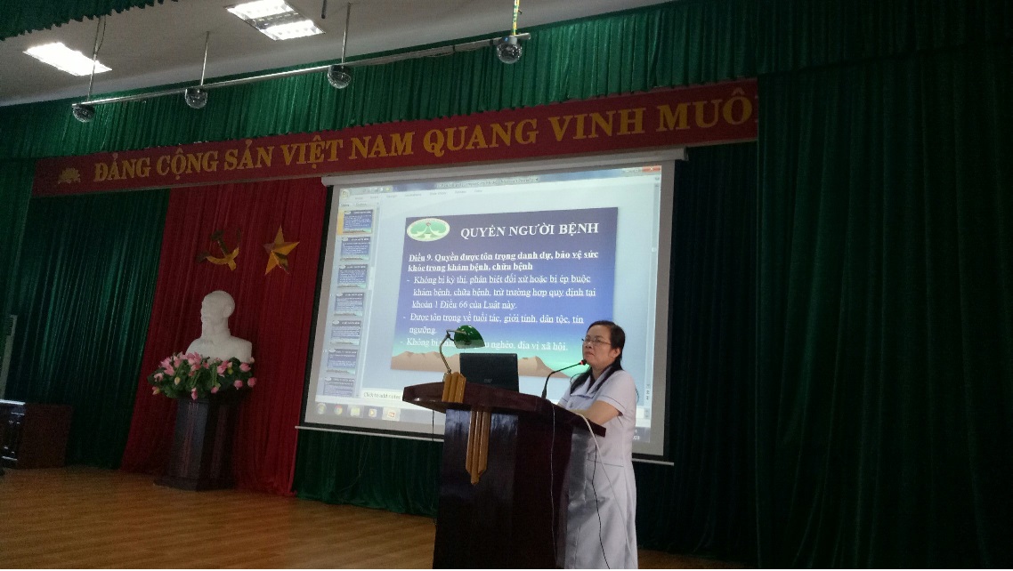 CN Đặng Thị Thu Trưởng phòng Điều dưỡng đã giới thiệu về Bệnh viện và một số dịch vụ khám, chữa bệnh tại khoa Quốc tế cũng như các gói dịch vụ khám chữa bệnh theo yêu cầu tại khoa Khám bệnh, dịch vụ lấy máu xét nghiệm tại nhà (trong khu vực Thành phố Thanh Hóa), đặc biệt là dịch vụ khám bệnh theo yêu cầu cho người nhà người bệnh đi chăm nuôi, đi thăm người thân đang nằm viện có nhu cầu khám bệnh, kiểm tra sức khỏe tại tất cả các Khoa,Trung tâm trong Bệnh viện với thủ tục nhanh chóng, thuận lợi và chính xác. Tại Hội nghị, NB và NNNB cũng được nghe trưởng phòng Điều dưỡng giới thiệu về những kỹ thuật chuyên sâu đã được bệnh viện triển khai trong thời gian vừa qua như: Phẫu thuật thay van tim, kỹ thuật can thiệp mạch não, kỹ thuật ghép thận từ người cho sống, kỹ thuật thăm dò điện sinh lí tim, khai trương phòng khám chống đau theo mô hình Nhật Bản (tại khoa Quốc tế). Ngoài ra, Hội đồng NB cũng được nghe phổ biến quyền và nghĩa vụ của người bệnh khi đến khám, chữa bệnh tại Bệnh viện cũng như những quy định, nội quy buồng bệnh của Bệnh viện.