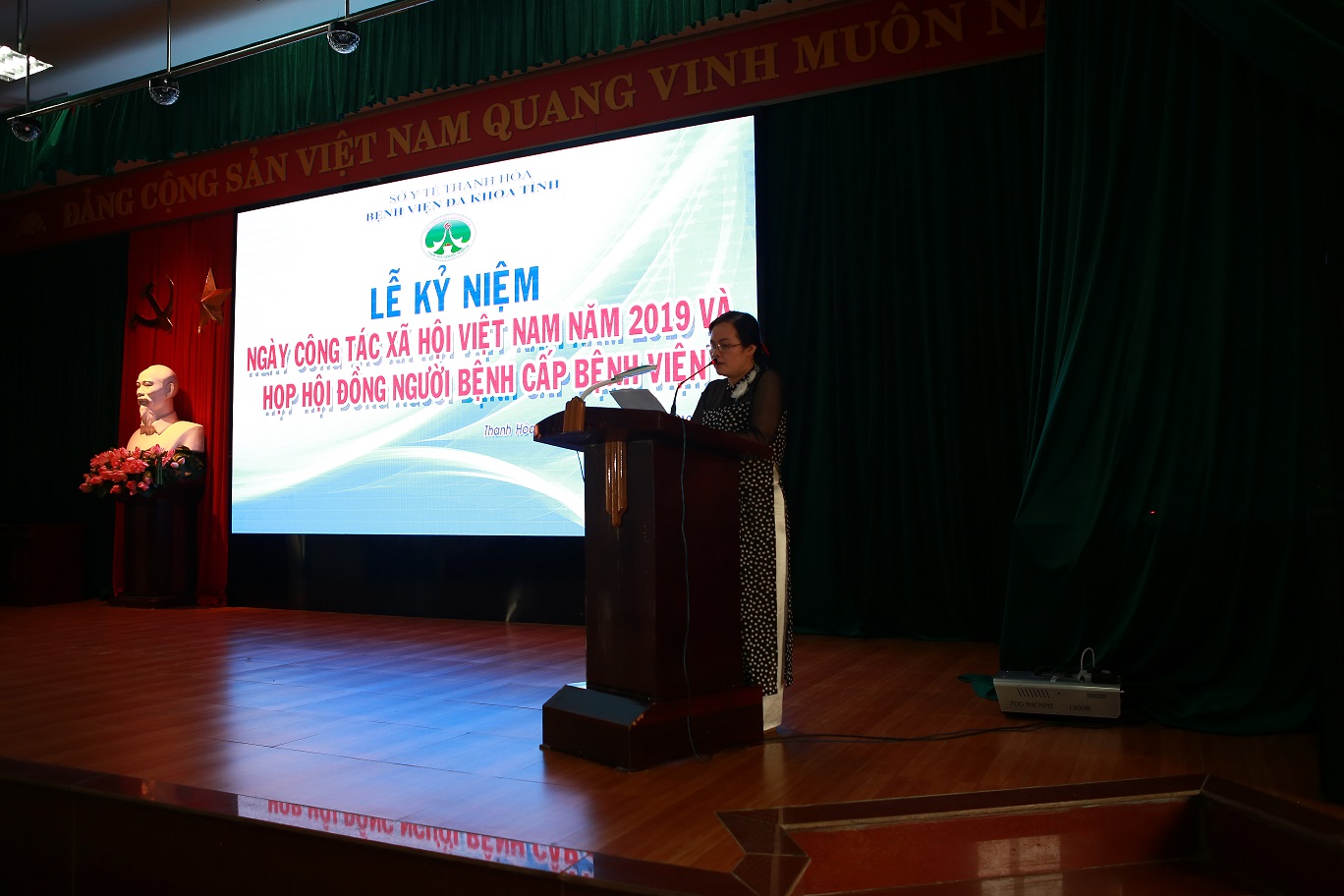 Ngày 25/3/2019, Bệnh viện Đa khoa tỉnh Thanh Hóa đã tổ chức Lễ kỷ niệm “Ngày công tác xã hội Việt Nam” và Họp Hội đồng người bệnh cấp Bệnh viện. Tham dự Hội nghị có đại diện Ban Giám đốc, Trưởng các phòng chức năng, Điều dưỡng trưởng và đại diện 200 người bệnh, người nhà người bệnh đến từ các khoa, phòng, trung tâm trong Bệnh viện.