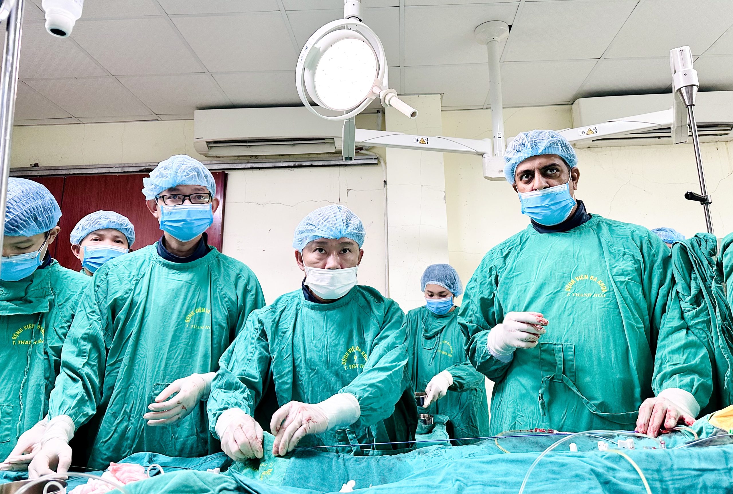 Ê-kíp y bác sĩ Bệnh viện Đa khoa tỉnh Thanh Hóa thực hiện thay van động mạch chủ qua da cho bệnh nhân dưới sự hỗ trợ của chuyên gia y tế Ấn Độ.