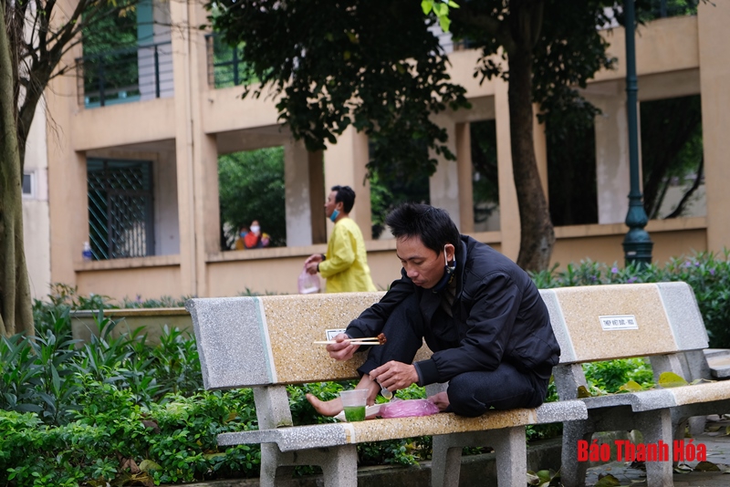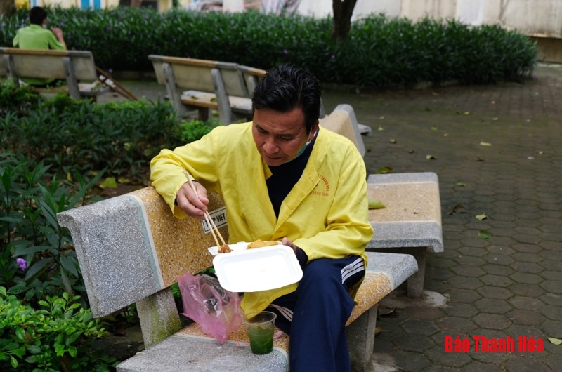 Tại khuôn viên của bệnh viện, chúng tôi dễ dàng bắt gặp hình ảnh bệnh nhân, người nhà bệnh nhân đang ngồi ăn cơm ở đây.