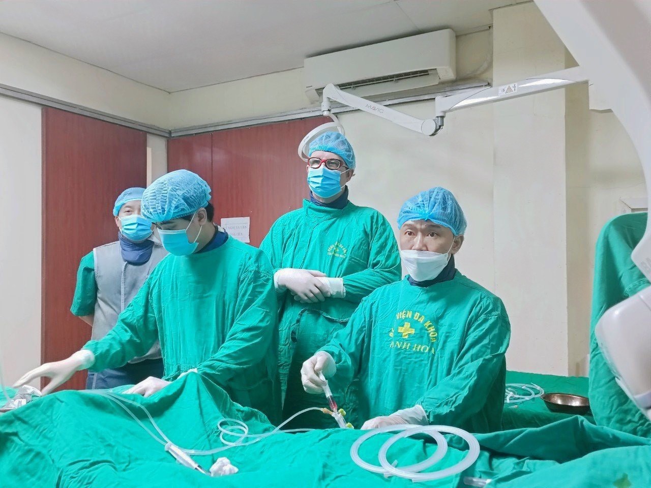 Các bác sĩ Đơn vị Can thiệp tim mạch, Bệnh viện Đa khoa tỉnh Thanh Hóa và Bác sĩ Daniel Weilenmann, Trưởng khoa Can thiệp Tim mạch, Bệnh viện Kantonsspital, Thụy Sĩ đang thực hiện 1 ca can thiệp động mạch vành phức tạp