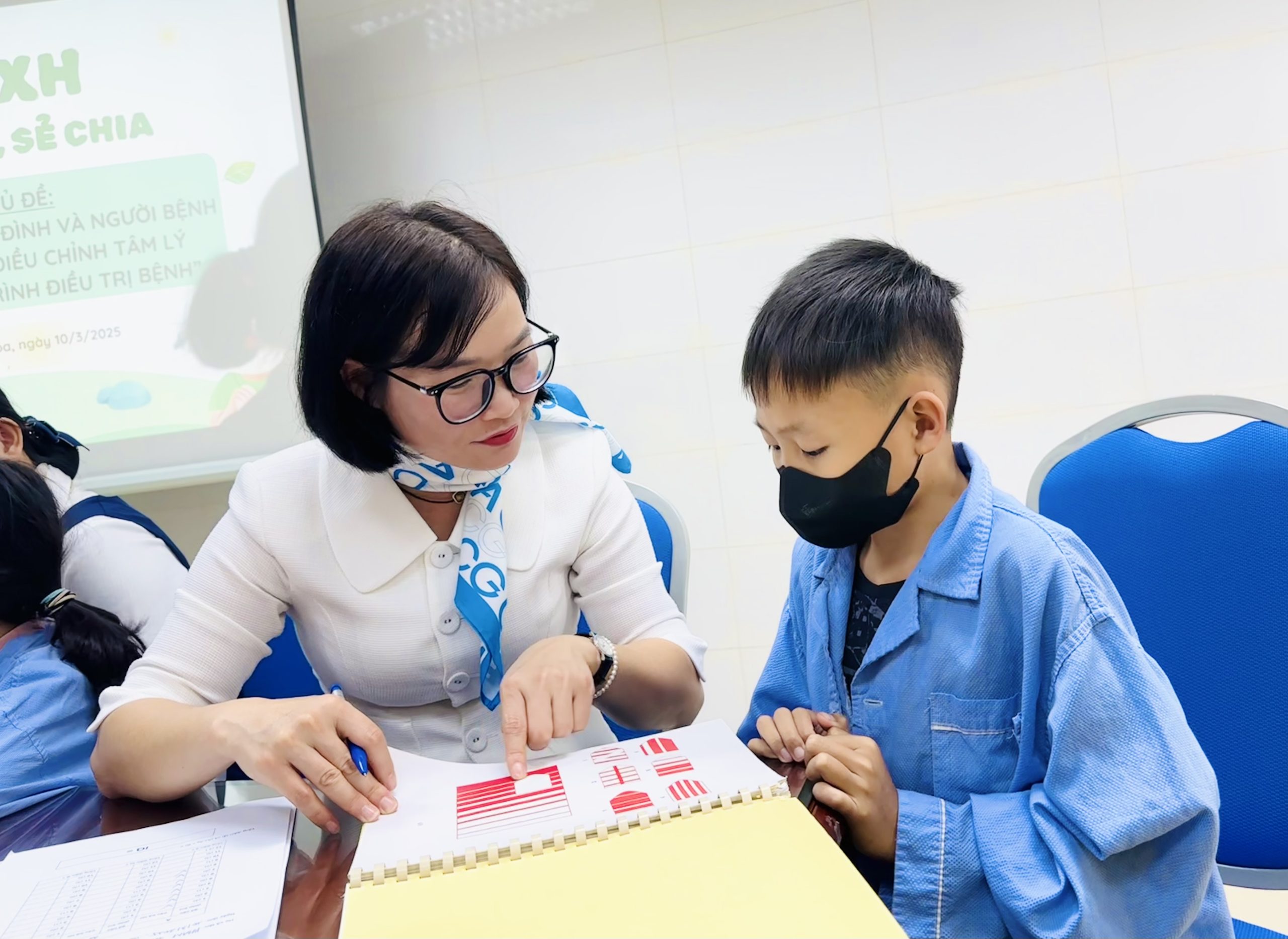 🔹 Nhóm 3: Hoạt động “Chong chóng ước mơ” do nhân viên CTXH hướng dẫn – nơi các em bệnh nhân nhi và gia đình có cơ hội tâm sự, tìm sự đồng cảm và hỗ trợ từ những người có cùng hoàn cảnh.
