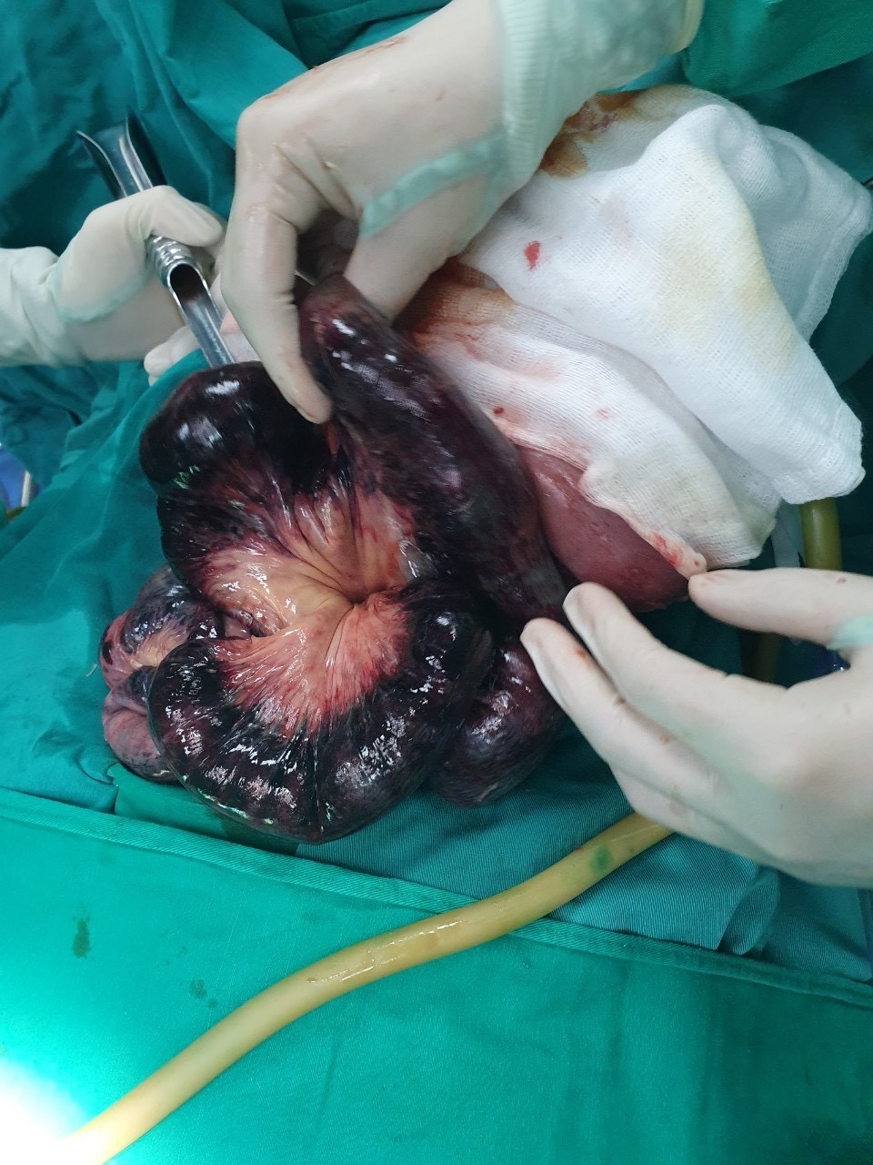Toàn bộ đoạn ruột hoại tử tím đen của bệnh nhân được các bác sĩ phẫu thuật cắt bỏ