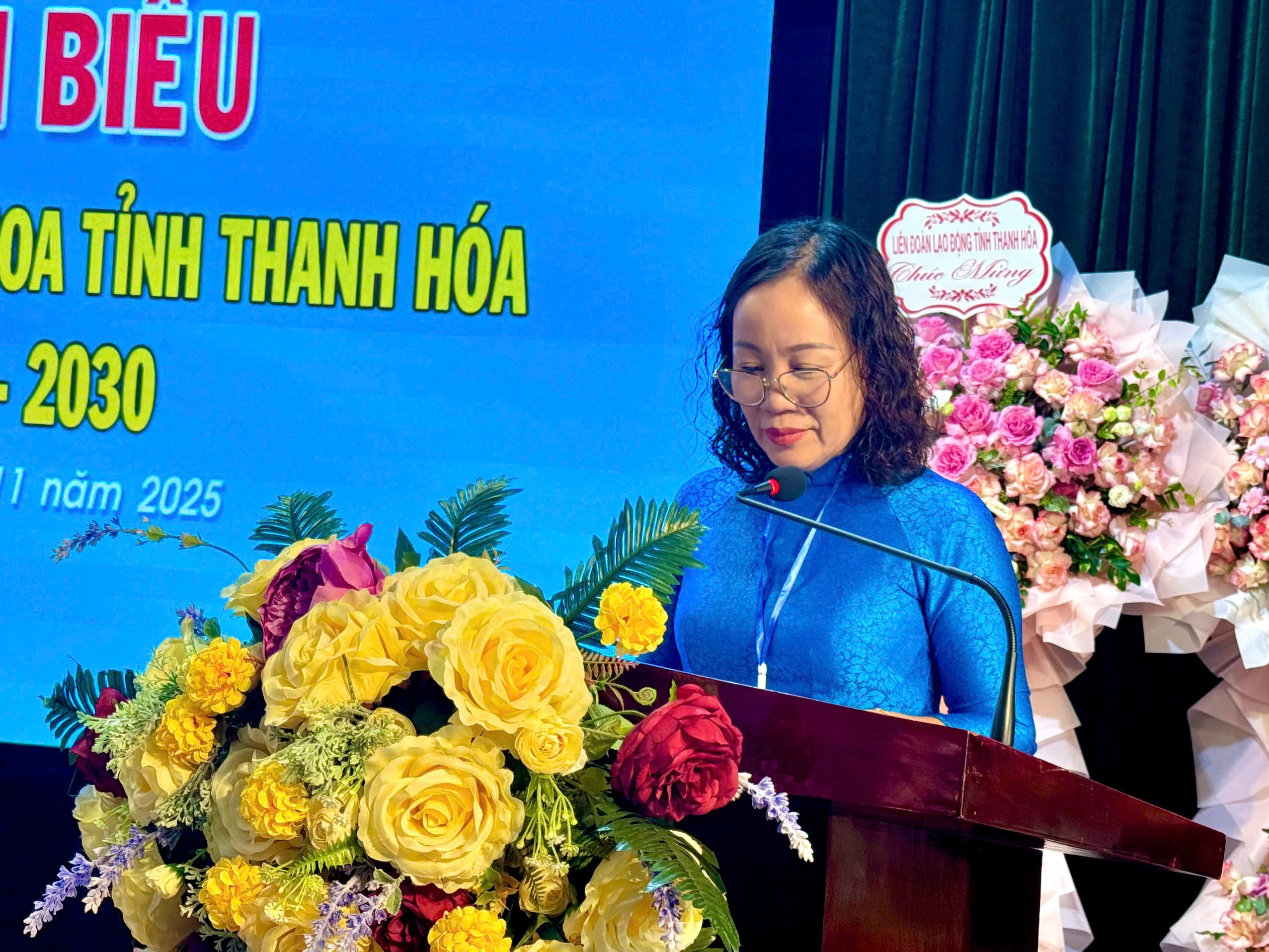 Phát biểu chỉ đạo tại Đại hội, đồng chí Trịnh Thị Hoa – Phó Chủ tịch Liên đoàn Lao động tỉnh Thanh Hoághi nhận, biểu dương và đánh giá cao những kết quả nổi bật mà Công đoàn Bệnh viện đã đạt được trong nhiệm kỳ qua. Đồng chí đề nghị, trong nhiệm kỳ tới, Công đoàn Bệnh viện cần tiếp tục phát huy tinh thần đoàn kết, đổi mới nội dung và phương thức hoạt động; chú trọng đại diện, chăm lo lợi ích thiết thực cho đoàn viên, người lao động; đẩy mạnh các phong trào thi đua gắn với chuyên môn; xây dựng đội ngũ cán bộ công đoàn có bản lĩnh, trí tuệ, tâm huyết; góp phần thực hiện thắng lợi các mục tiêu phát triển của ngành Y tế tỉnh Thanh Hóa.