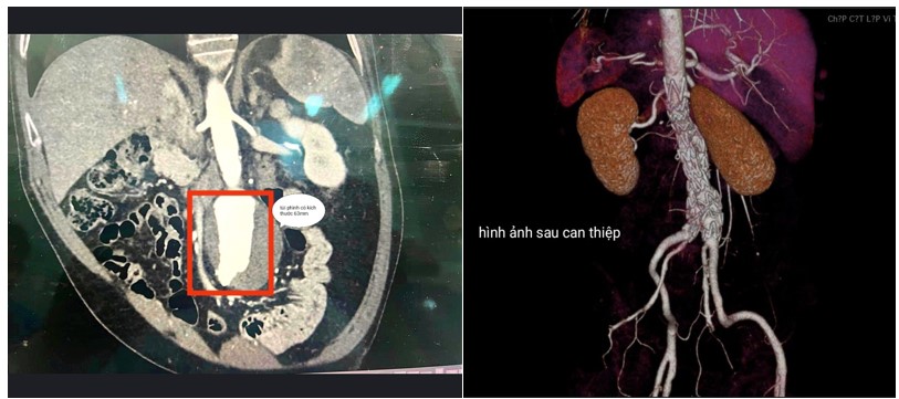 Sau khi được thăm khám, làm các xét nghiệm cần thiết, các bác sĩ phát hiện trên phim chụp cắt lớp 128 dẫy, bệnh nhân có khối phình động mạch chủ bụng với kích thước 63x 83mm, có xơ vữa dày 17mm, kèm phình động mạch chậu chung phải 22mm và động mạch chậu trái 27mm. Nhận định đây là khối phình lớn có nguy cơ vỡ rất cao và nguy hiểm đến tính mạng nếu không được can thiệp kịp thời, các bác sĩ đã quyết định tiến hành đặt Stent Graft cho bệnh nhân.