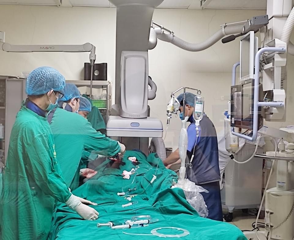 Các y bác sĩ đang thực hiện một ca đặt stent graft cho bệnh nhân phình động mạch chủ bụng