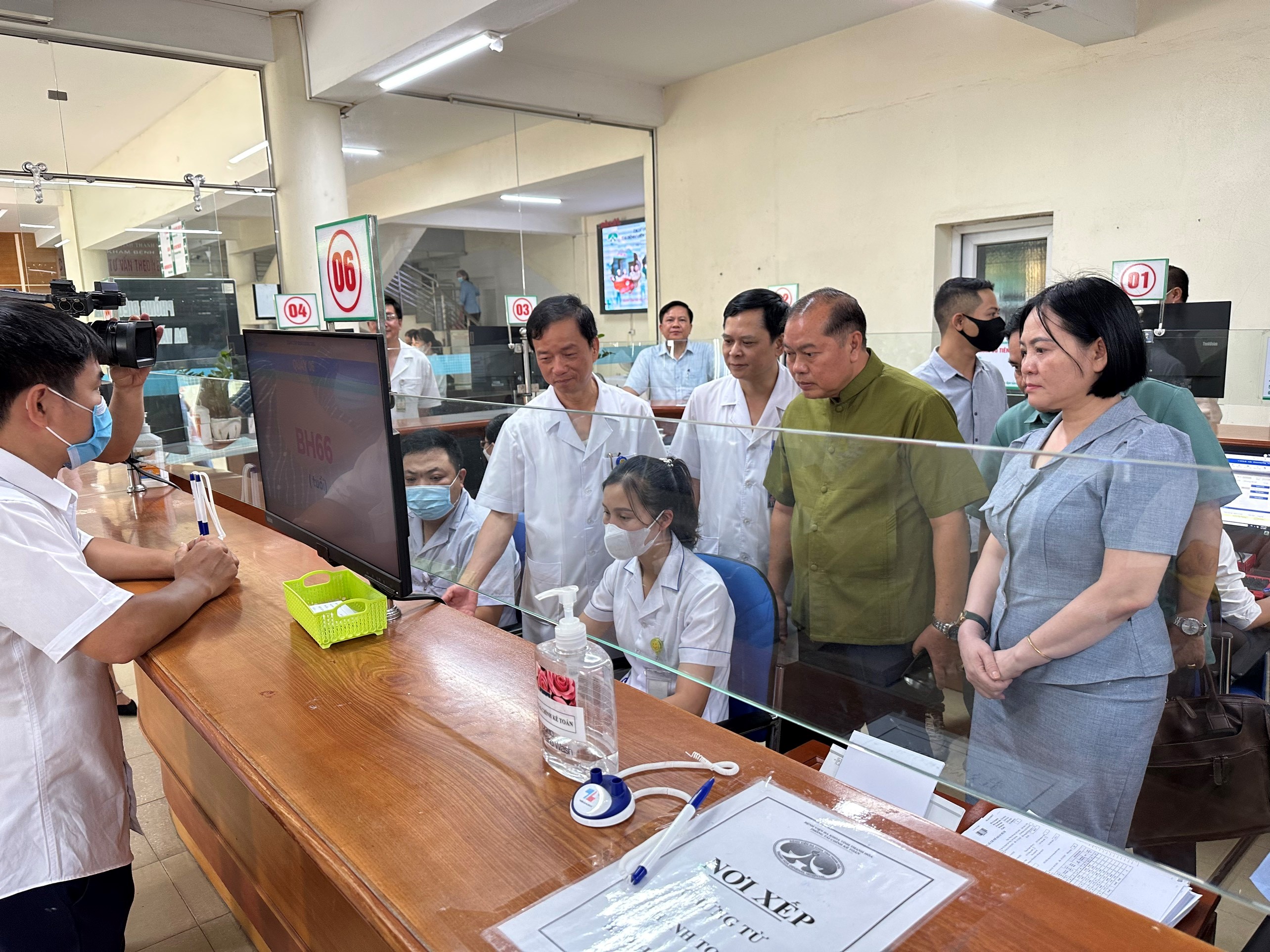 Cũng trong khuôn khổ chương trình, Đoàn đại biểu Bộ Công an Lào đã đi thăm thực tế việc triển khai ứng dụng tại khu vực tiếp đón ban đầu của Bệnh viện.