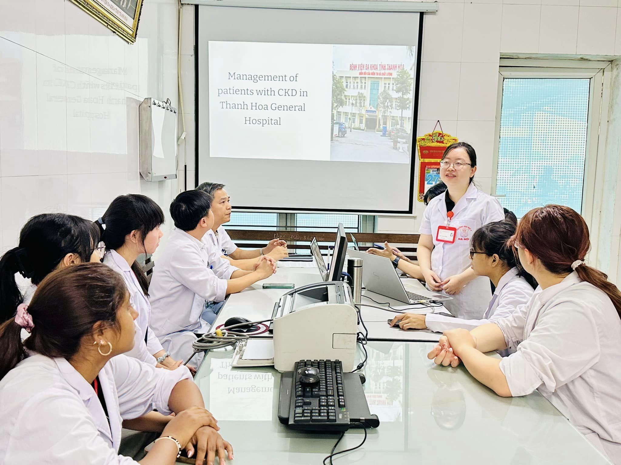 Đại diện Lãnh đạo phòng ĐT-CĐT, khoa Nội thận – Tiết niệu, Bệnh viện Đa khoa tỉnh Thanh Hóa và đại diện các tổ chuyên môn Phân hiệu Trường ĐH Y Hà Nội, cùng các sinh viên trao đổi một số nội dung chuyên môn