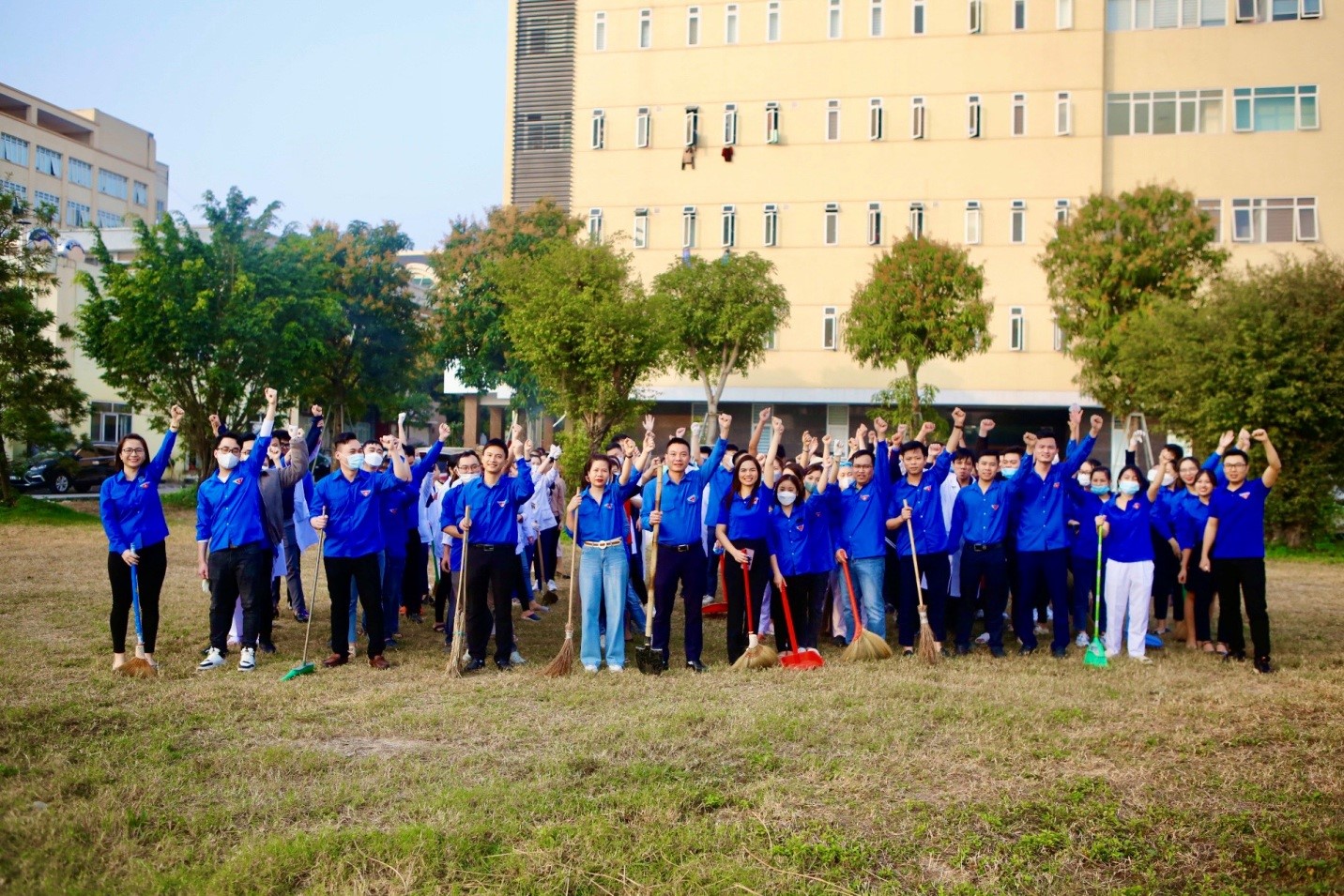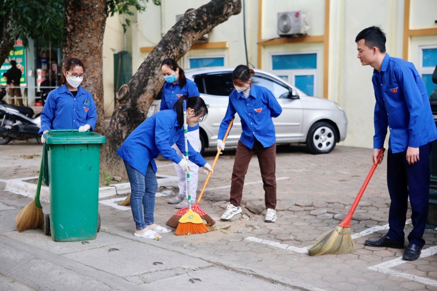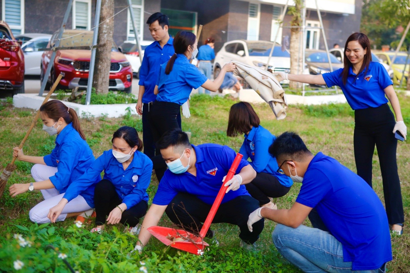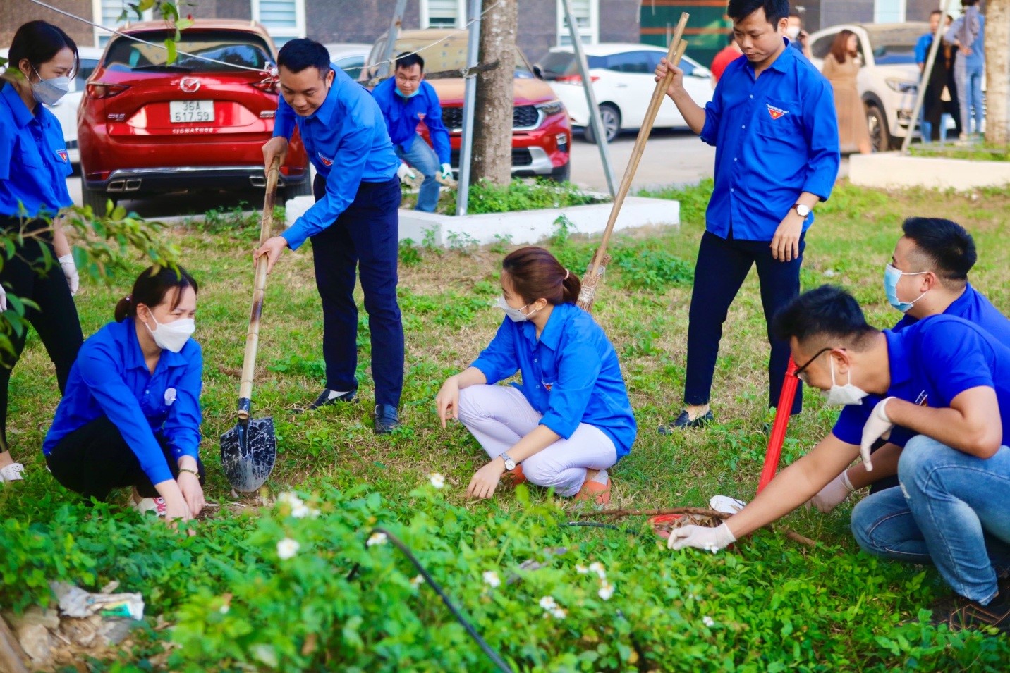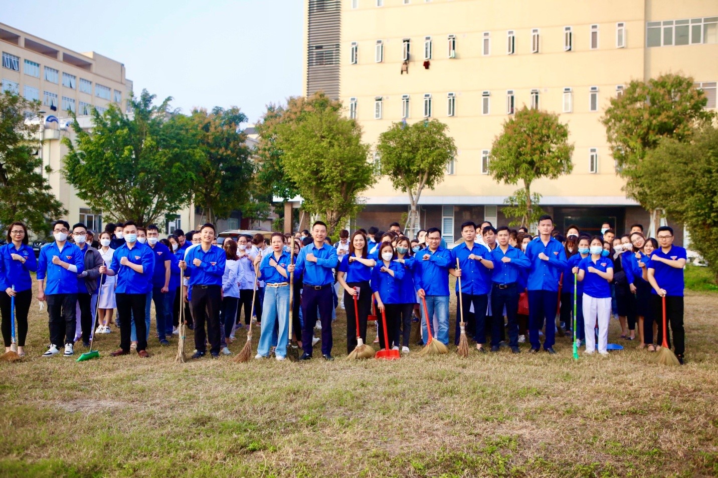 Đông đảo đoàn viên thanh niên tích cực tham gia dọn dẹp vệ sinh nơi làm việc, khuôn viên Bệnh viện