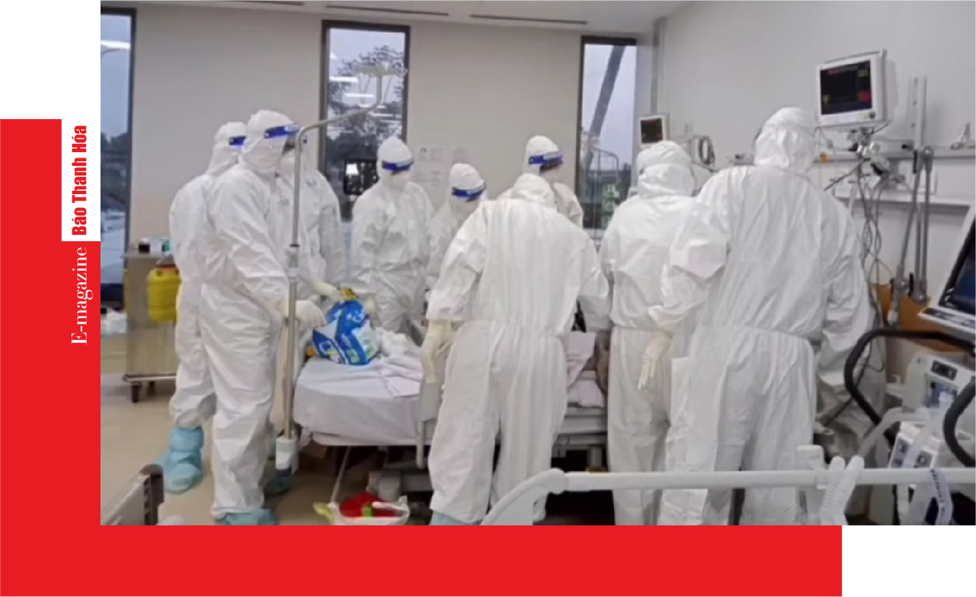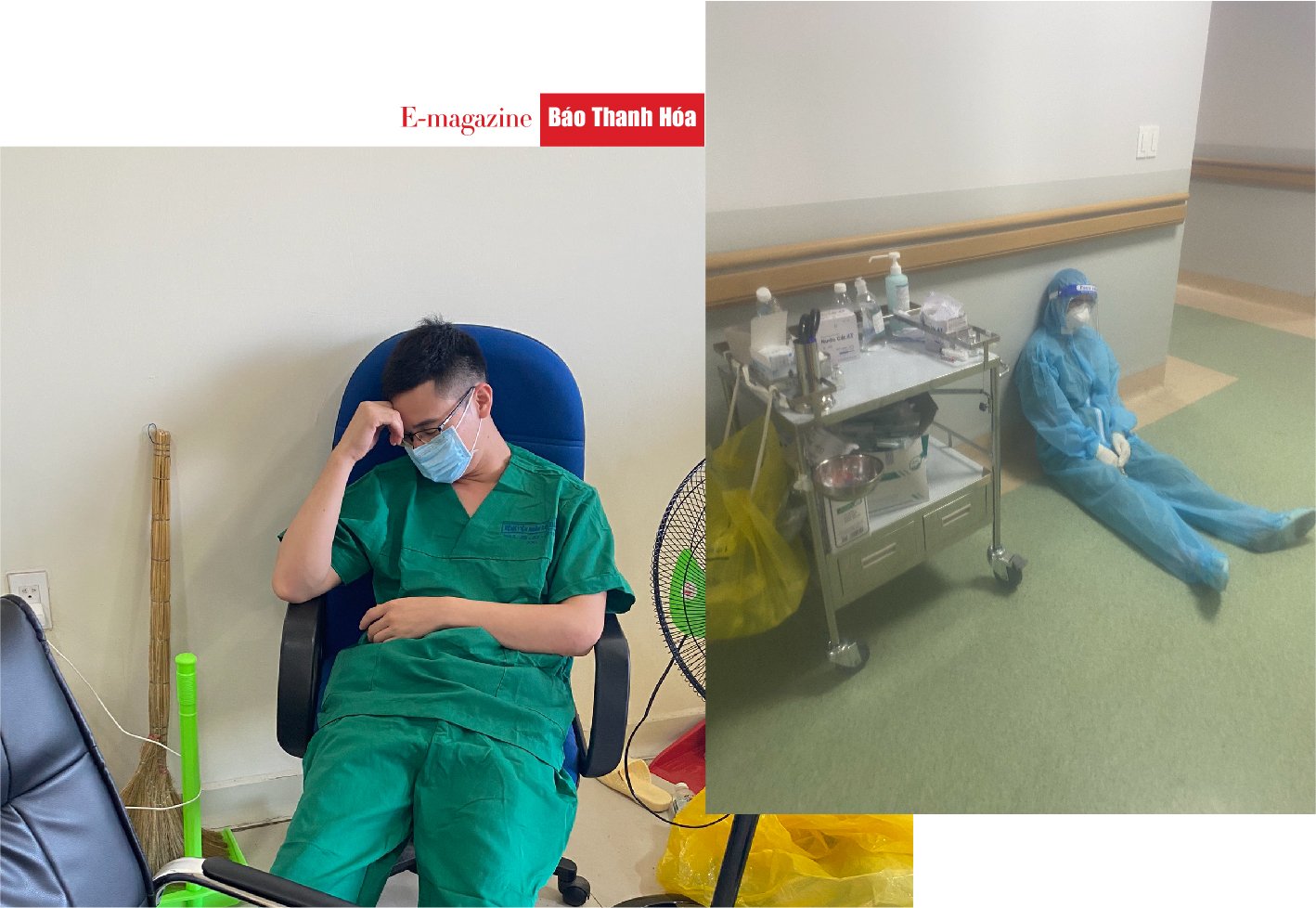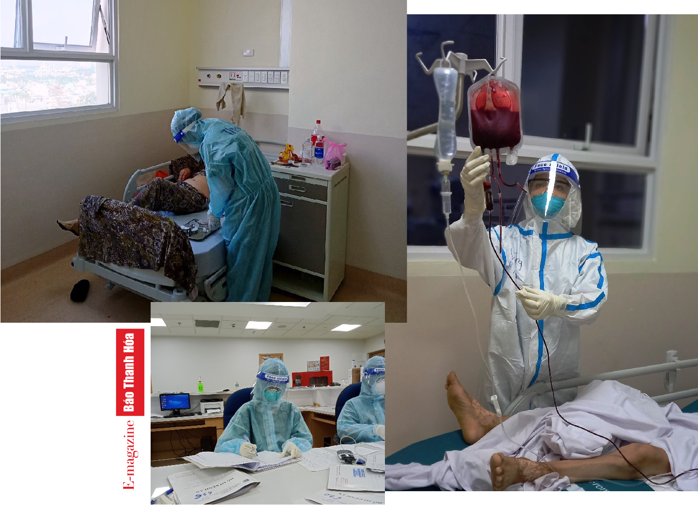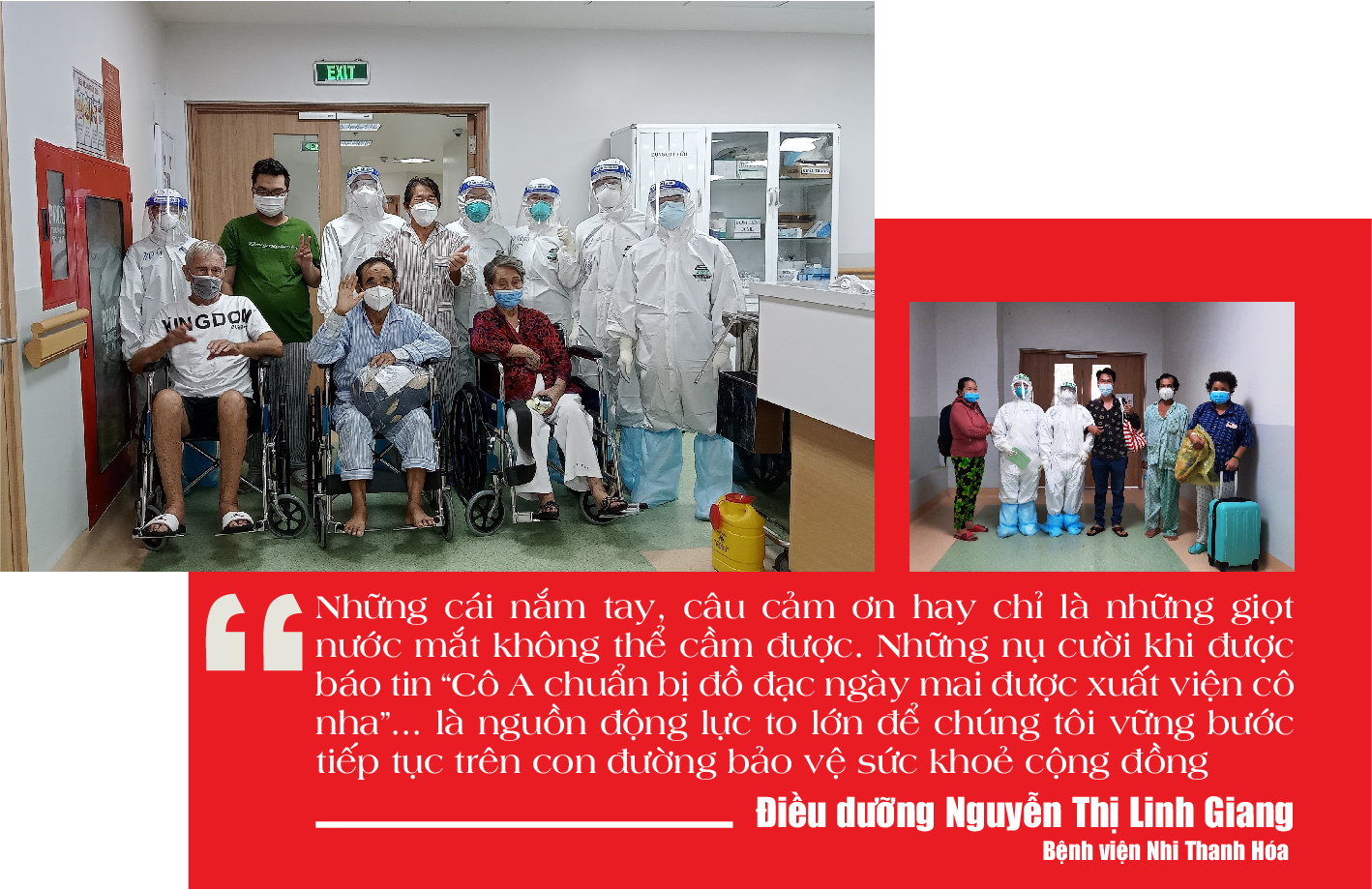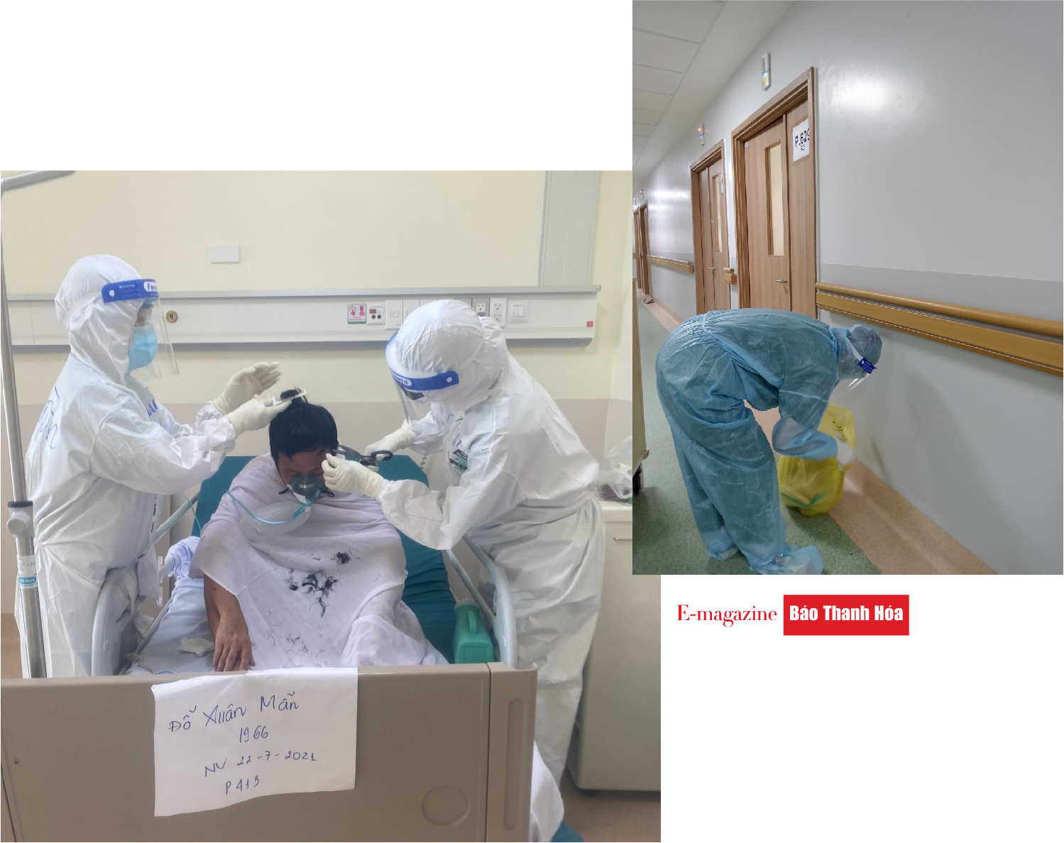 Còn đối với Điều dưỡng Nguyễn Thị Xuân Quý, Khoa Bệnh Nhiệt đới, Bệnh viện Đa khoa tỉnh Thanh Hóa được phân công chăm sóc bệnh nhân nặng tầng 5, ngay ngày đầu tiên tiếp nhận 20-30 bệnh nhân nặng. Sau 2 ngày đã kín 62 giường với lực lượng mỏng chỉ 4-5 điều dưỡng và 2 bác sĩ chăm sóc, điều trị cho bệnh nhân trong điều kiện hộ lý không có, nhân viên môi trường không có. Bác sĩ phải làm cả việc của điều dưỡng và điều dưỡng làm cả những công việc của hộ lý, vệ sinh khoa phòng, vệ sinh cho bệnh nhân, hỗ trợ bệnh nhân ăn uống… vì đặc thù của bệnh nhân COVID-19 là không cho người thân vào chăm sóc. Chính họ cũng đã có những phút giây sợ hãi khi cường độ công việc quá lớn, nguy cơ quá cao, có thể lây nhiễm bất cứ lúc nào, trong khi bệnh nhân nặng cứ ồ ạt được chuyển đến, có những bệnh nhân quá yếu không thể khai thác được thông tin, không có giấy tờ tùy thân…