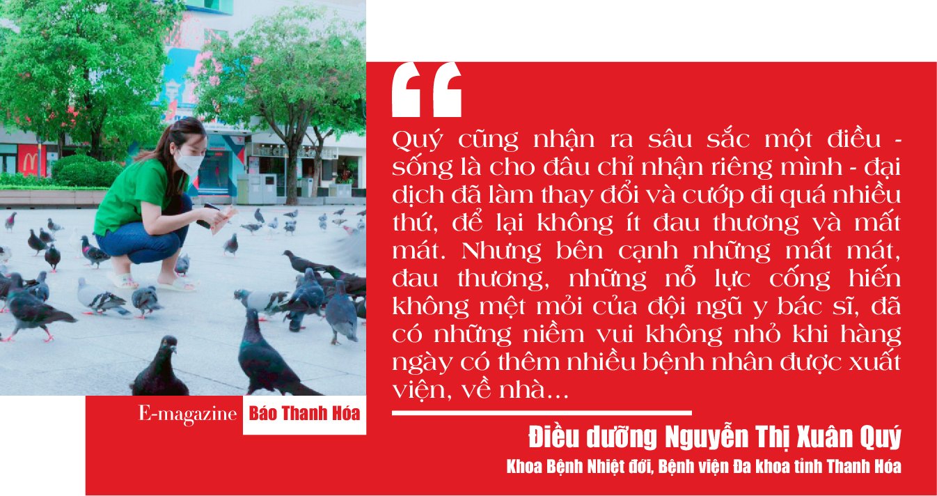 Điều dưỡng Nguyễn Thị Xuân Quý đã không quên được trường hợp một bệnh nhân sau những ngày chiến đấu với COVID-19 đã khỏi bệnh, được cho xuất viện về nhà nhưng thay vì vui mừng, thì chính bệnh nhân này đã xin được ở lại bệnh viện vì những người thân trong gia đình anh đã mất vì COVID-19, nhà anh ở chung cư cao tầng đang bị phong tỏa, bản thân anh không biết đi đâu, về đâu. Quý cũng nhận ra sâu sắc một điều – sống là cho đâu chỉ nhận riêng mình – đại dịch đã làm thay đổi và cướp đi quá nhiều thứ, để lại không ít đau thương và mất mát. Nhưng bên cạnh những mất mát, đau thương, những nỗ lực cống hiến không mệt mỏi của đội ngũ y bác sĩ, đã có những niềm vui không nhỏ khi hàng ngày có thêm nhiều bệnh nhân được xuất viện, về nhà… Đây là động lực để chị Quý cùng đồng nghiệp tiếp tục nỗ lực để góp một phần nhỏ bé của mình vào cuộc chiến chống lại đại dịch COVID-19.