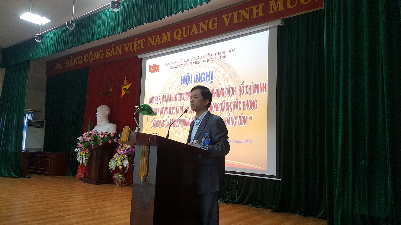 Thực hiện công văn số 475-CV/ĐUK ngày 06/3/2018 của Đảng bộ Khối các cơ quan tỉnh Thanh Hóa về việc tổ chức Hội nghị học tập chuyên đề năm 2018 về tư tưởng, đạo đức, phong cách Hồ Chí Minh, sáng 13/3/2018, tại Hội trường lớn của Bệnh viện Đa khoa tỉnh Thanh Hóa đại diện gần 400 đảng viên, người lao động trong Bệnh viện Đa khoa đã được nghe Giáo sư – Tiến sĩ Hoàng Chí Bảo, nguyên Ủy viên Hội đồng lý luận Trung ương, chuyên gia cao cấp Học viện Chính trị Quốc gia Hồ Chí Minh trực tiếp truyền đạt chuyên đề năm 2018 về “Xây dựng phong cách, tác phong công tác của người đứng đầu, của cán bộ, đảng viên trong học tập và làm theo tư tưởng, đạo đức, phong cách Hồ Chí Minh” do Ban Thường vụ Tỉnh ủy Thanh Hóa tổ chức qua sóng Đài truyền hình Thanh Hóa.