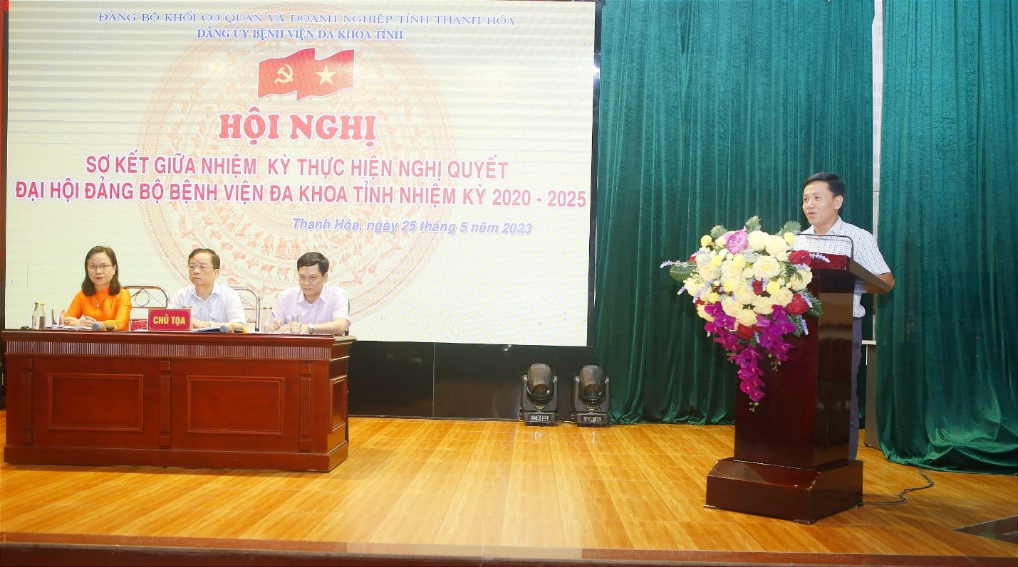 Tại Hội nghị, đồng chí Hoàng Hữu Trường – Phó Bí thư Đảng bộ, Phó Giám đốc Bệnh viện đã thay mặt BCH Đảng bộ Bệnh viện trình bày báo cáo Sơ kết giữa nhiệm kỳ thực hiện Nghị quyết Đại hội Đảng bộ Bệnh viện Đa khoa tỉnh Thanh Hóa nhiệm kỳ 2020 – 2025 và mục tiêu, nhiệm vụ, giải pháp phương hướng, nhiệm vụ cho nửa nhiệm kỳ còn lại.