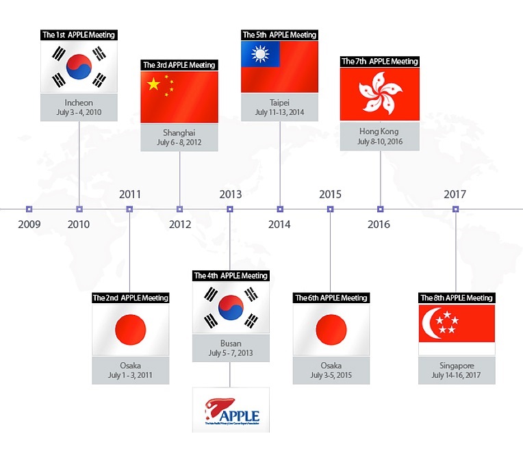Năm 2010, APPLE được tổ chức với sự tham gia & đồng thuận cao từ 3 quốc gia là Hàn Quốc, Nhật Bản & Trung quốc. Mục tiêu ban đầu của APPLE là xây dựng sự kết nối giữa các giáo sư chuyên gia và các bác sĩ của 3 nước nhằm thảo luận chuyên sâu để hướng tới điều trị ung thư gan tốt nhất.