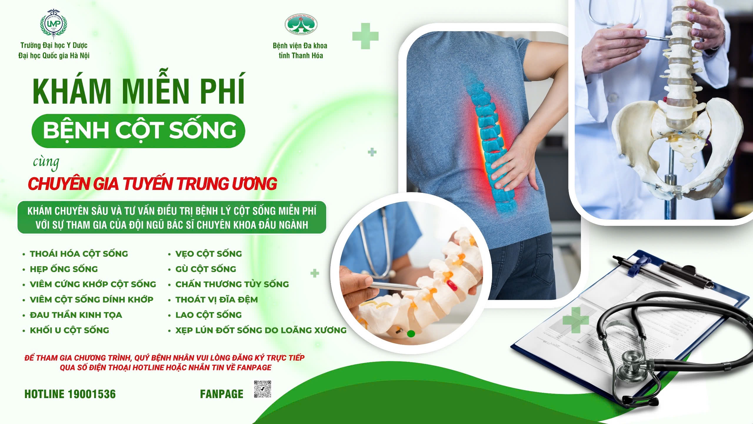 Nội dung khám: Khám chuyên sâu và tư vấn điều trị bệnh lý cột sống miễn phí với sự tham gia của đội ngũ bác sĩ chuyên khoa đầu ngành đến từ Bộ môn Phẫu thuật Cột sống – Trường Đại học Y Dược, Đại học Quốc gia Hà Nội và các Bác sĩ chuyên khoa Phẫu thuật Thần kinh – Lồng ngực, Bệnh viện Đa khoa tỉnh Thanh Hóa.