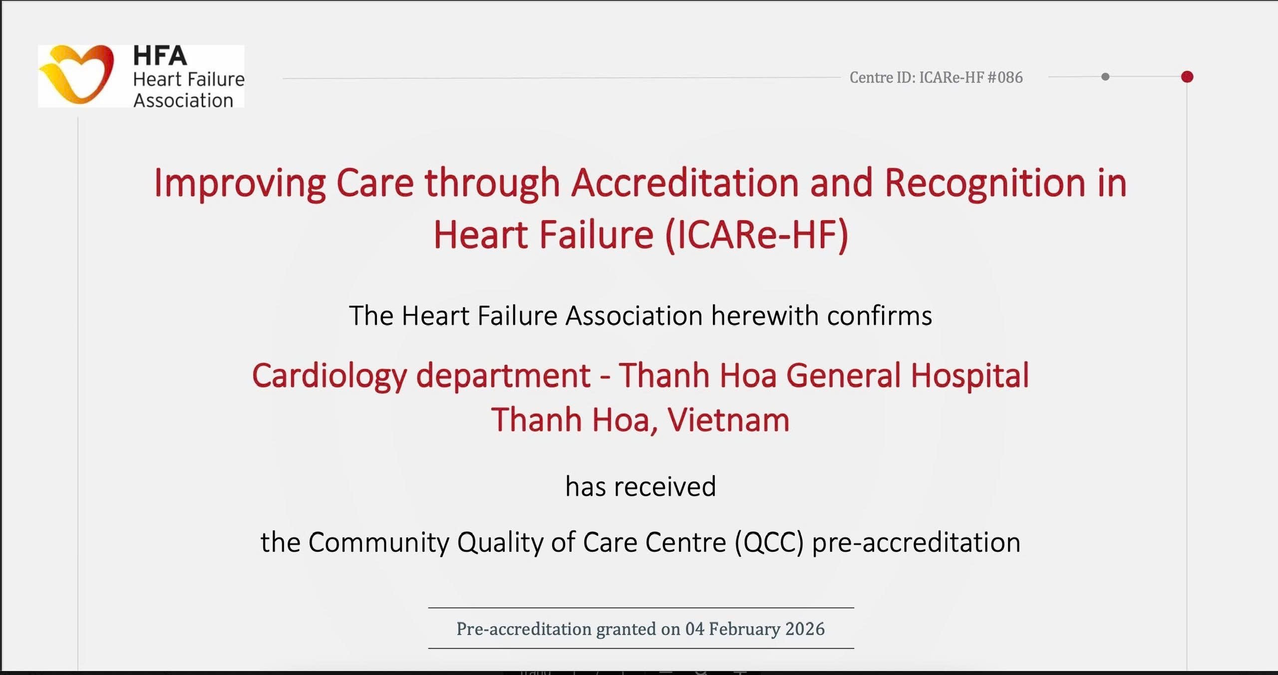 Theo chứng nhận do HFA cấp, Khoa Nội Tim mạch của Bệnh viện Đa khoa tỉnh Thanh Hóa đã được công nhận đạt mức Community Quality of Care Centre (QCC) pre-accreditation vào ngày 04/02/2026. Đây là cấp độ đánh giá dành cho các trung tâm có hệ thống quản lý, điều trị suy tim cộng đồng đáp ứng các tiêu chí về nhân lực, quy trình chuyên môn, khả năng áp dụng phác đồ điều trị chuẩn và hiệu quả lâm sàng.