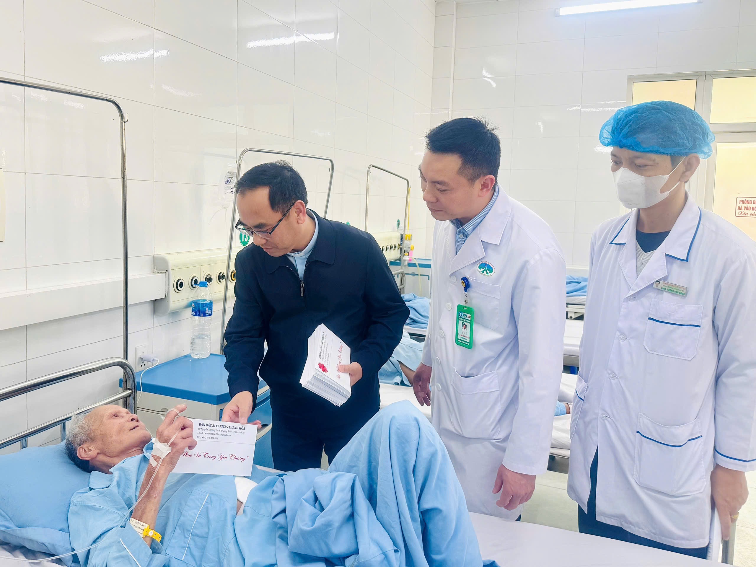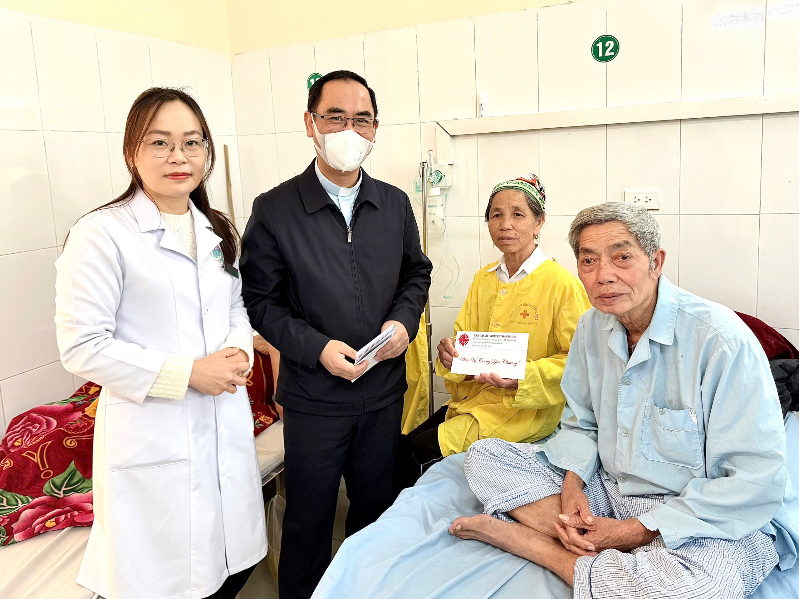 Linh mục Nguyễn Văn Thường và đại diện phòng Công tác xã hội thăm hỏi, tặng quà cho bệnh nhân khoa Nội Tim mạch