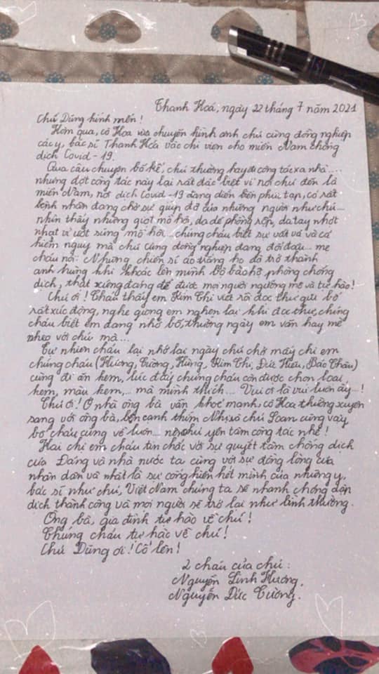 Chúng tôi xin mượn lời của bức thư đứa cháu thân yêu nhắn gửi anh – người bác sĩ yêu quý và đáng mến của cả gia đình: “Chặng đường chống dịch còn dài, còn nhiều gian nan, vất vả nhưng với sự quyết tâm của Đảng và Nhà nước, với sự đồng lòng của nhân dân và đặc biệt là sự cống hiến hết mình của những y bác sĩ, Việt Nam ta sẽ chiến thắng đại dịch, đất nước sẽ sớm trở lại những ngày bình yên”.