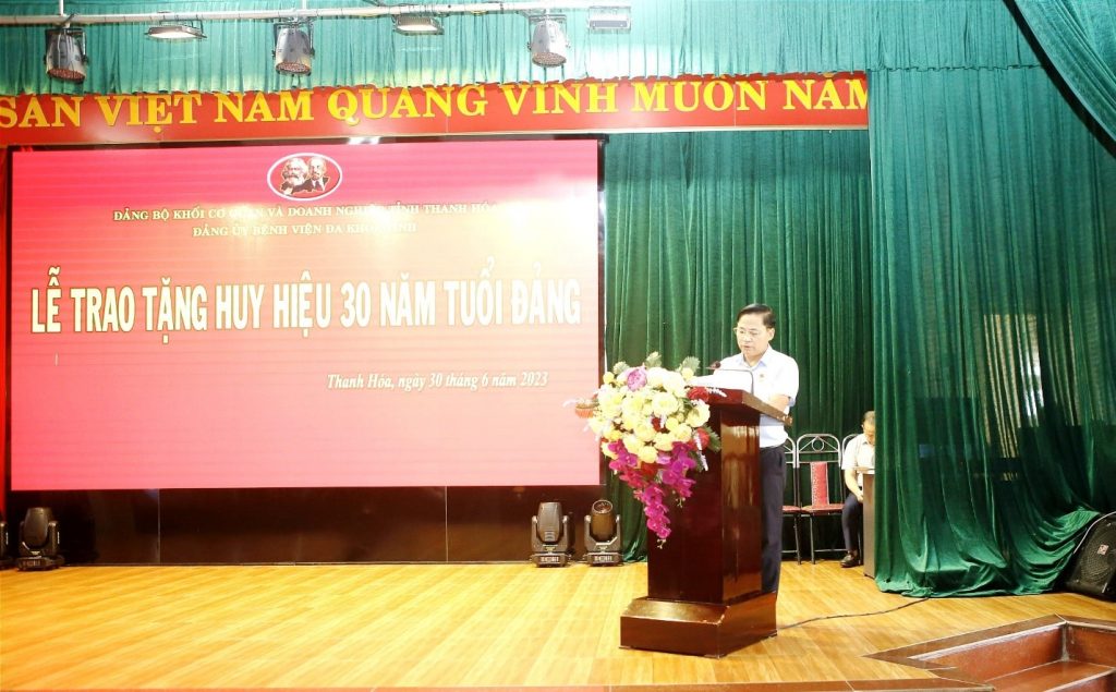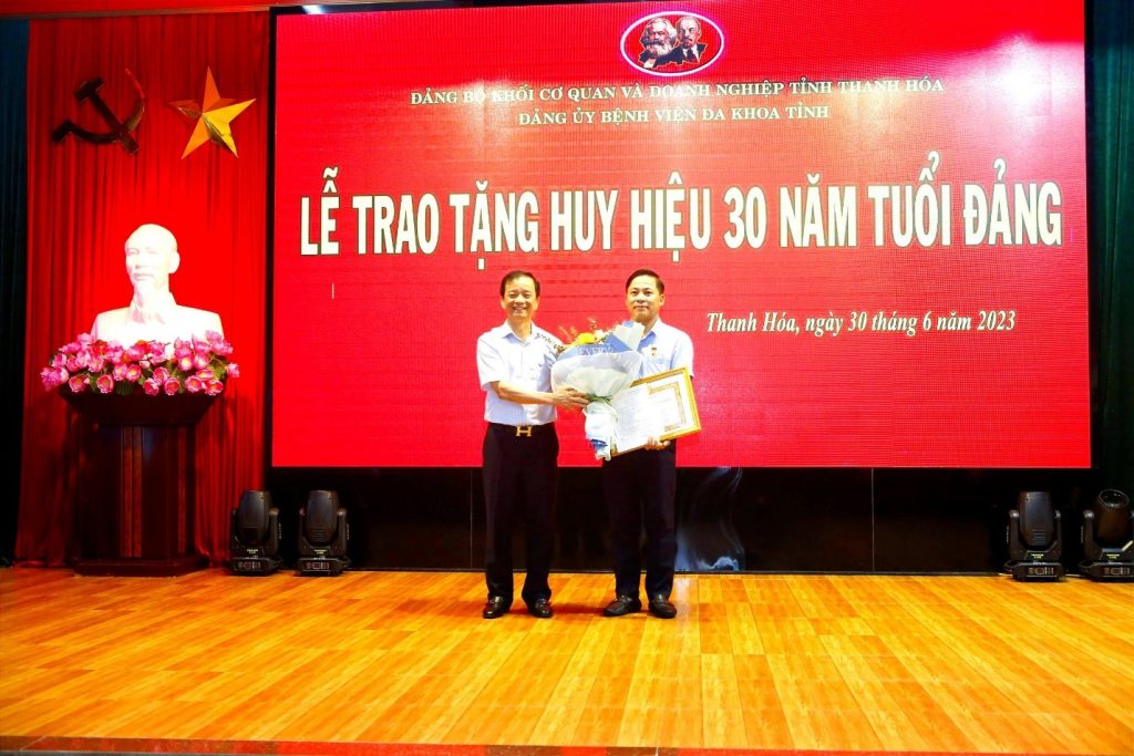 Chiều 30-6-2023, Đảng bộ Bệnh viện Đa khoa tỉnh Thanh Hóa tổ chức Lễ trao tặng Huy hiệu 30 năm tuổi Đảng cho BSCKII Mai Thế Long –Phó Bí thư Chi bộ – Phó trưởng khoa Ngoại tổng hợp 2.