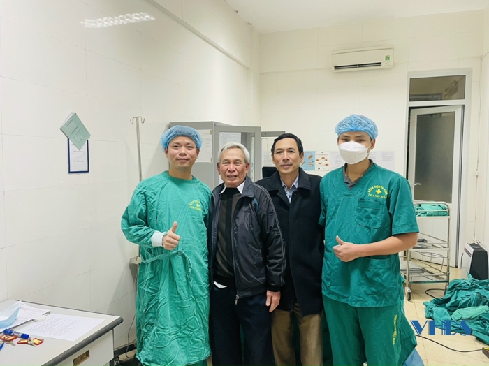 BS Nguyễn Văn Ngọc (ngoài cùng, bên trái) chụp ảnh lưu niệm cùng bệnh nhân sau một ca can thiệp thành công.